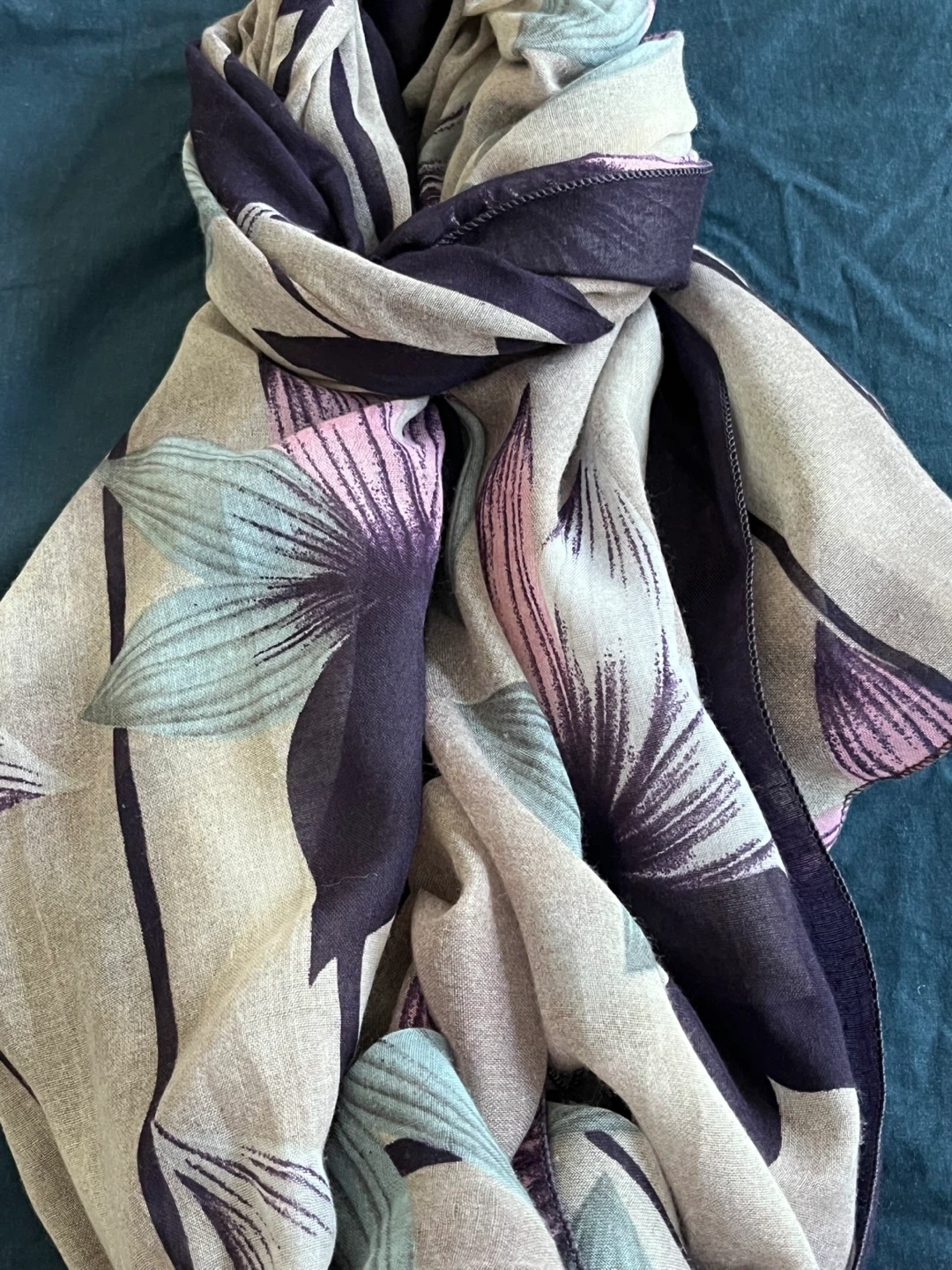 Soft floral print scarf with a mix of purple, pink, blue, and grey tones. It's a lovely accessory for any outfit. The fabric feels light and drapes nicely. Measures approximately 180cm x 70cm.