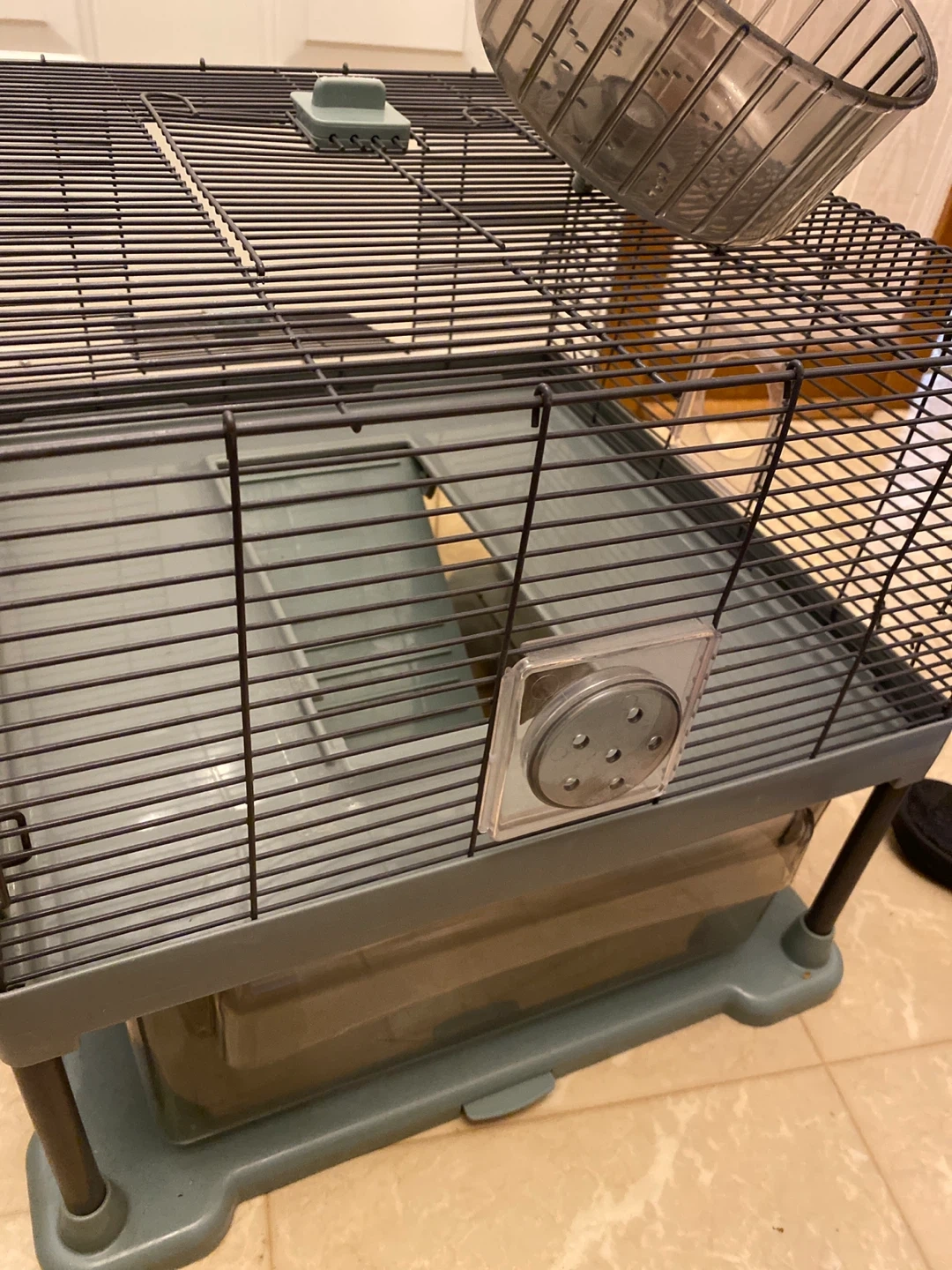 This pet cage comes with a water bottle, a food dish, and a small ramp. It has a wire top and plastic base for easy cleaning. It's suitable for small animals like hamsters or gerbils. Includes original packaging.