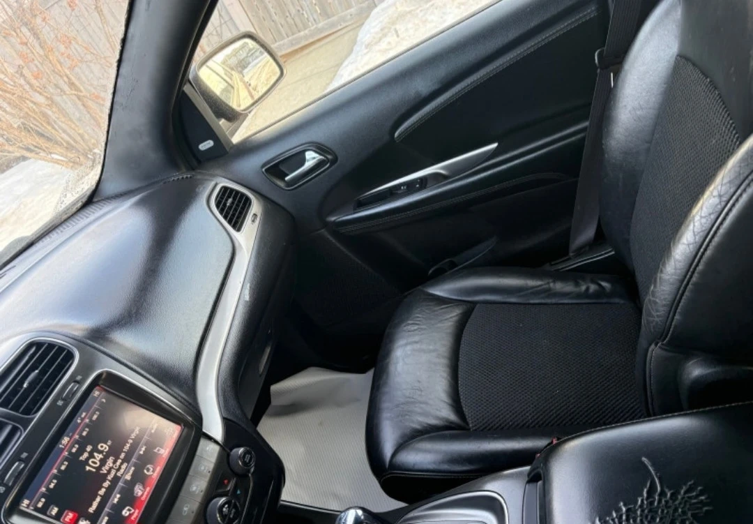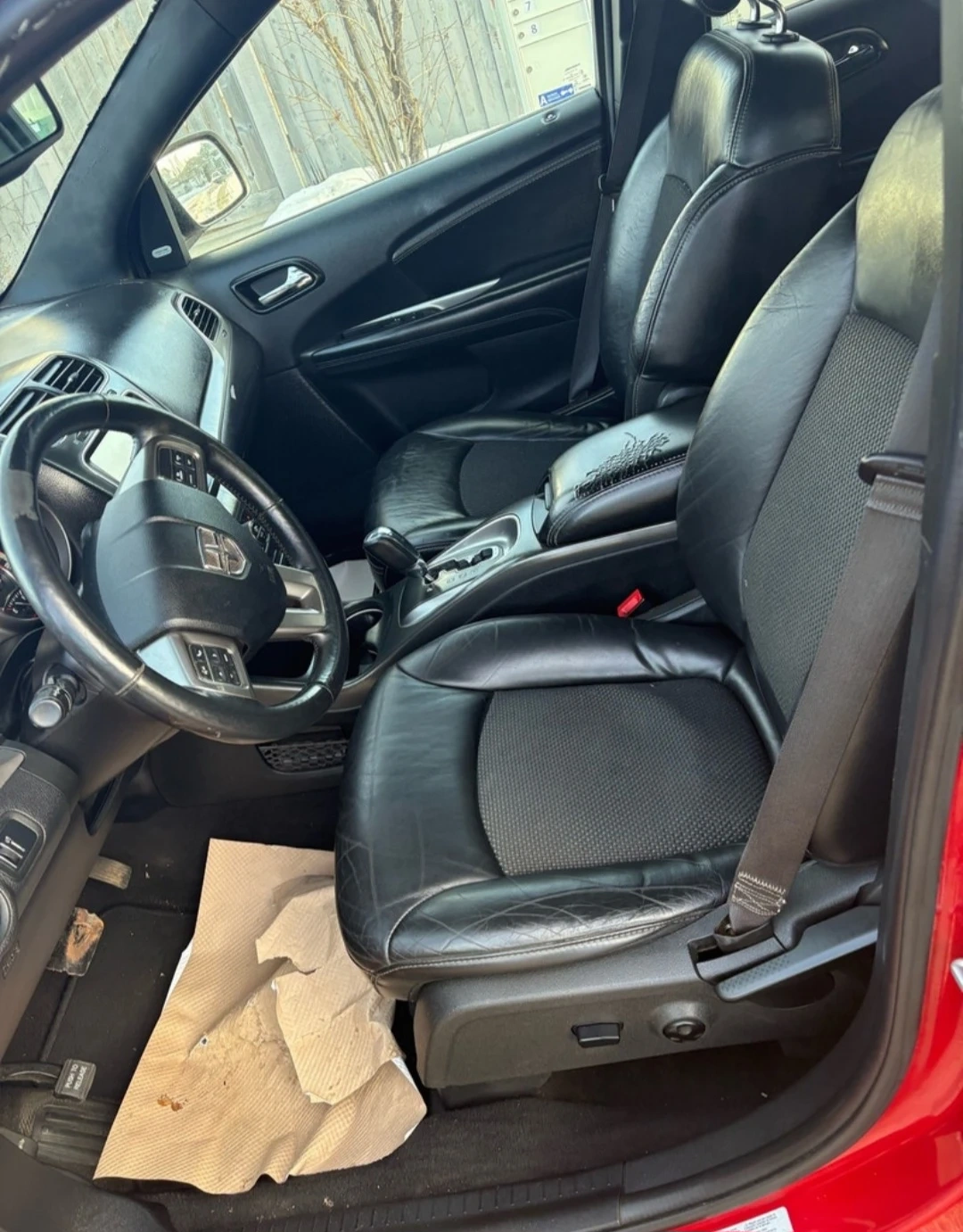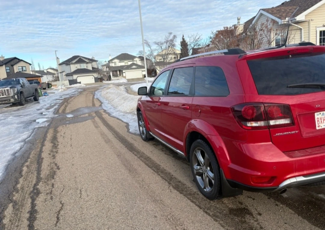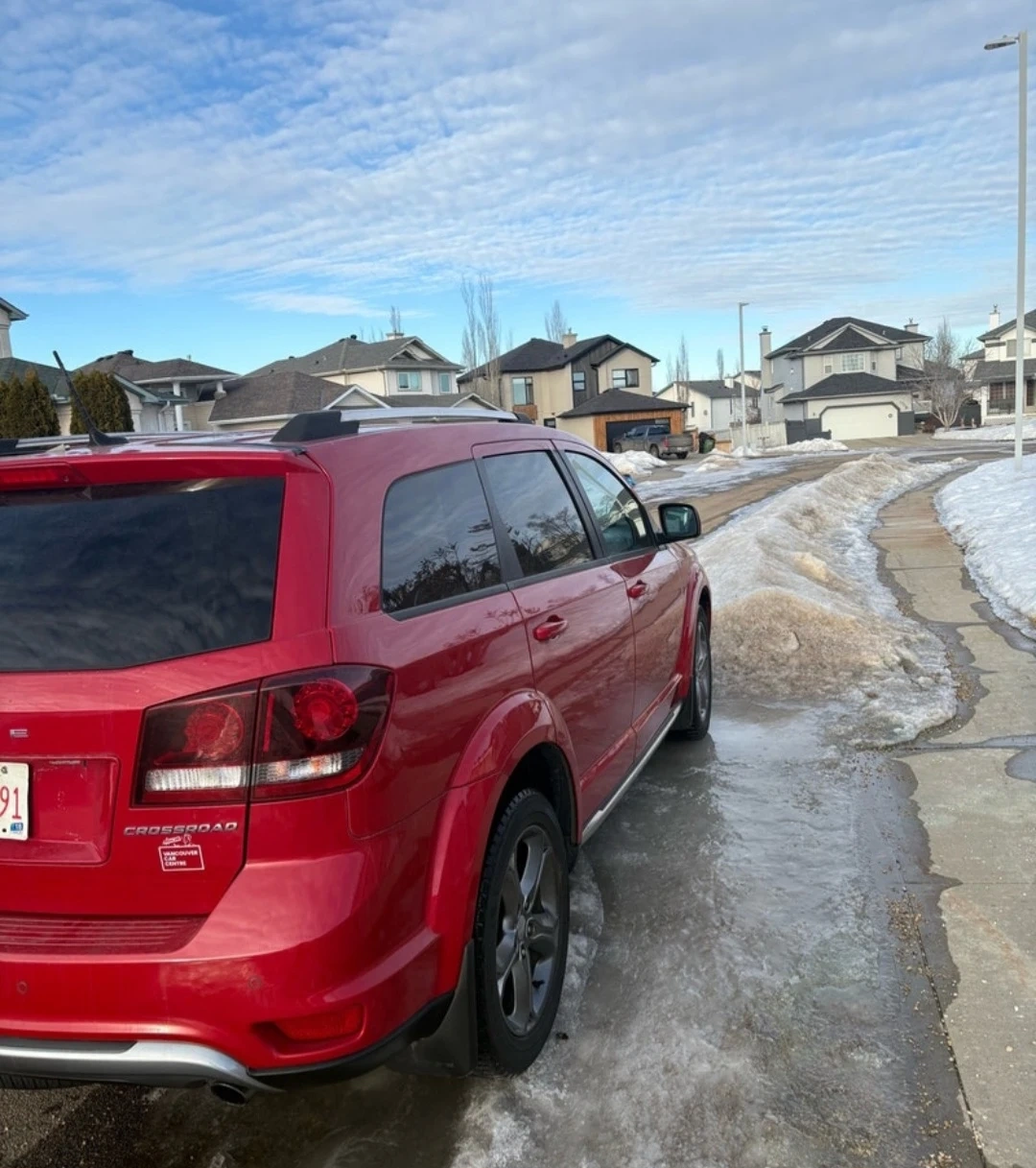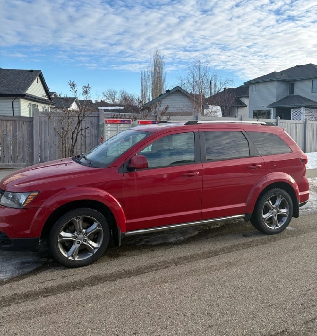 2017 red Dodge Journey is a crossover vehicle. It features black leather interior seats. Plenty of cargo space for hauling gear or groceries! Has about 185000 kms