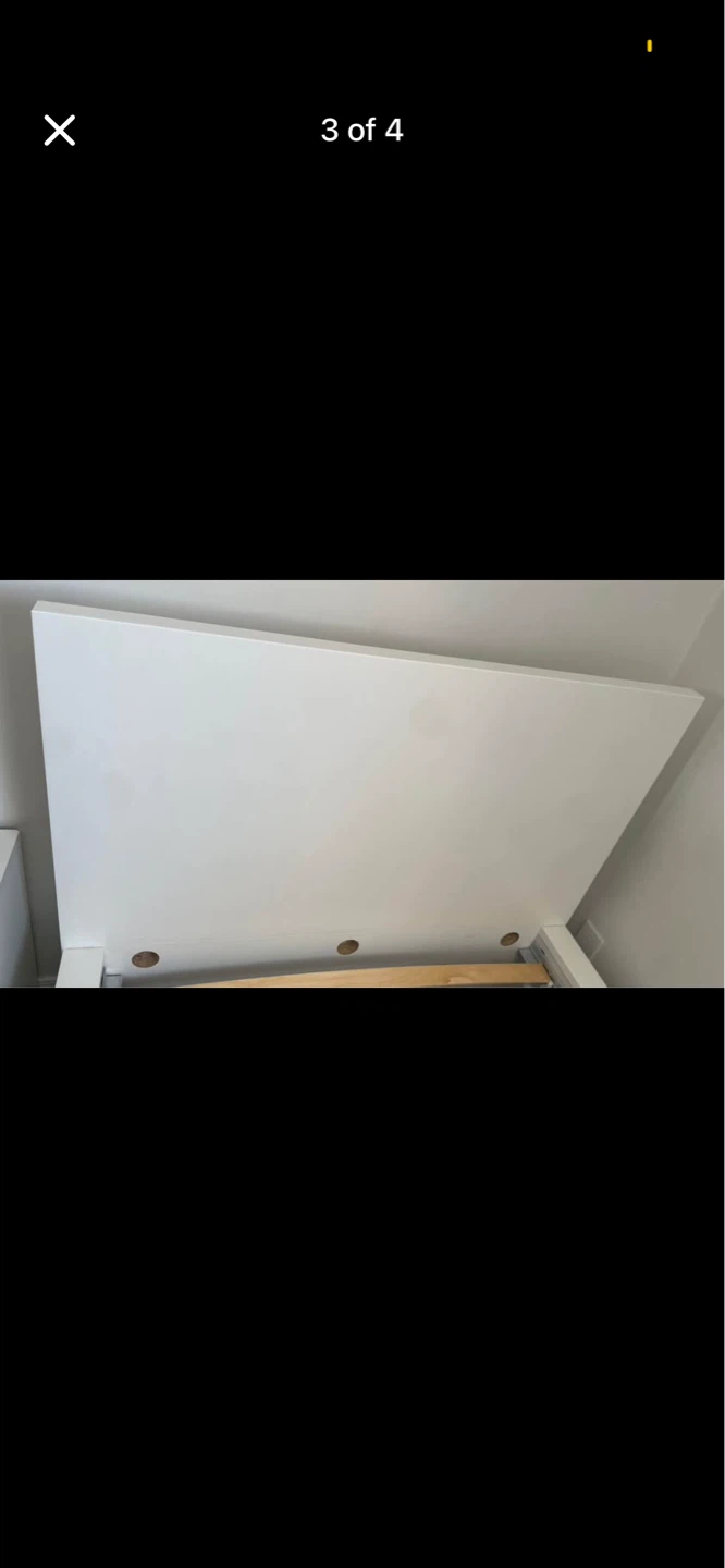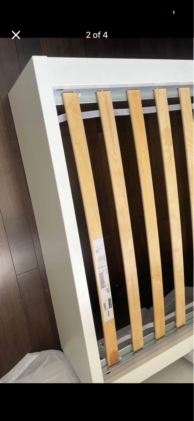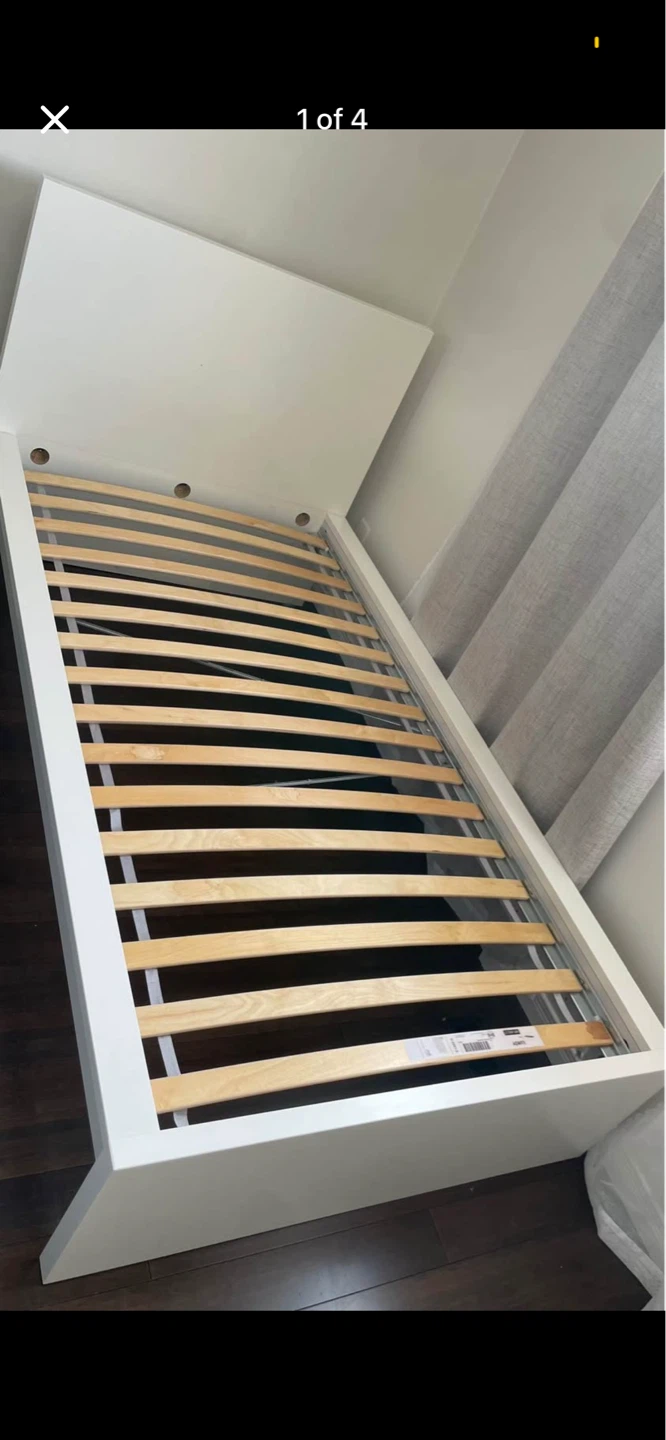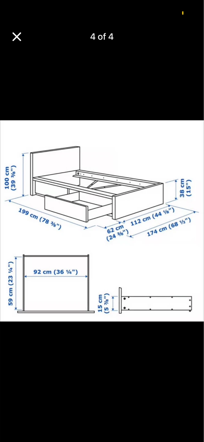 This is a white twin bed frame from IKEA. It measures 78 5/8" (199 cm) long and 44 1/8" (112 cm) wide. The headboard is 39 3/8" (100 cm) high. It includes one storage drawer. This bed frame is made of wood. It's a great option for small spaces!