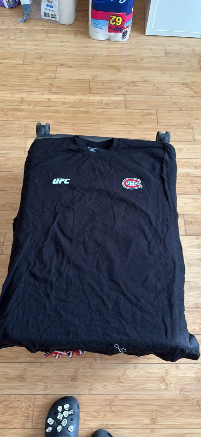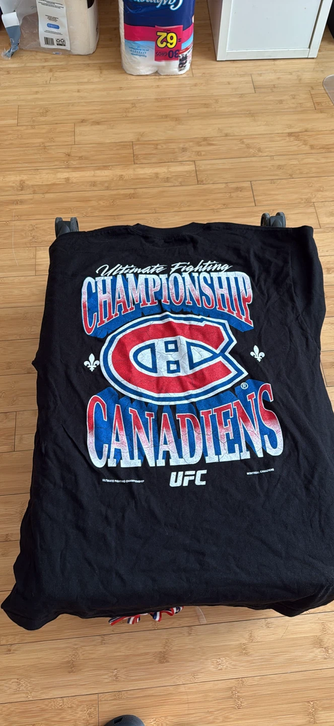 Black t-shirt featuring UFC and Montreal Canadiens branding. It's a size XXL. Perfect for any hockey or MMA fan!
