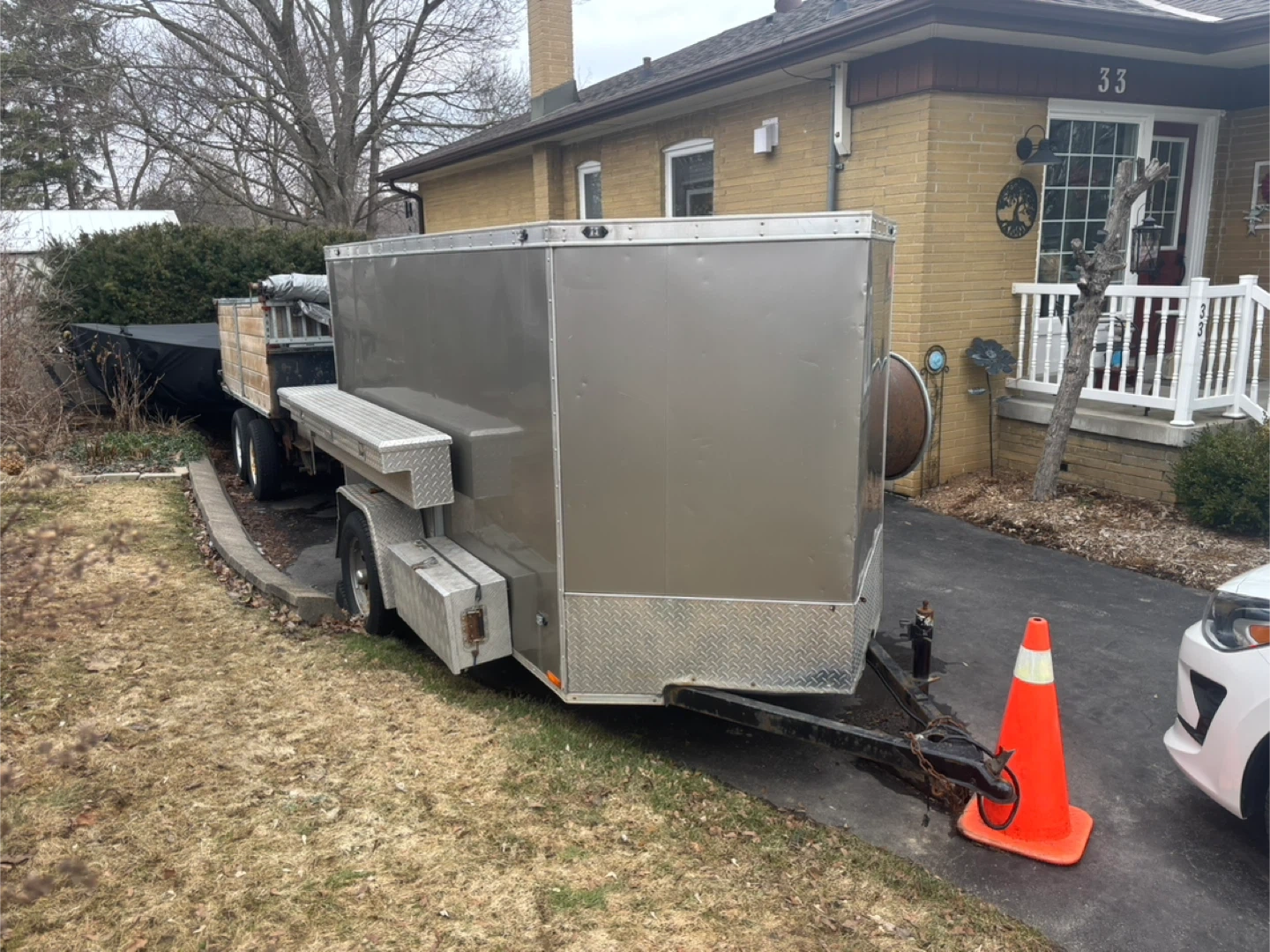 This is a grey enclosed cargo trailer manufactured by Miska Trailers. It has a GVWR of 1356 kg and a payload capacity of 962 kg. The trailer is equipped with a diamond plate toolbox mounted on the side.