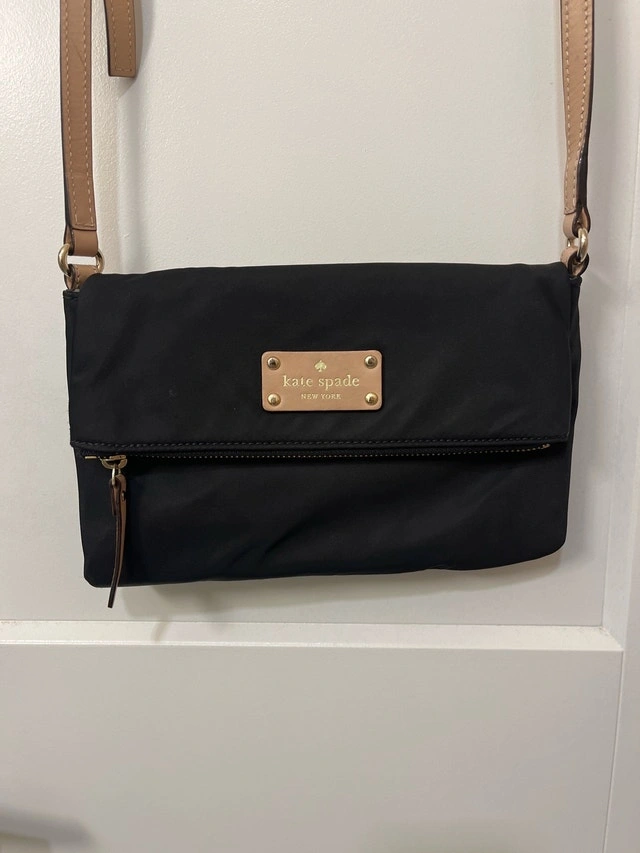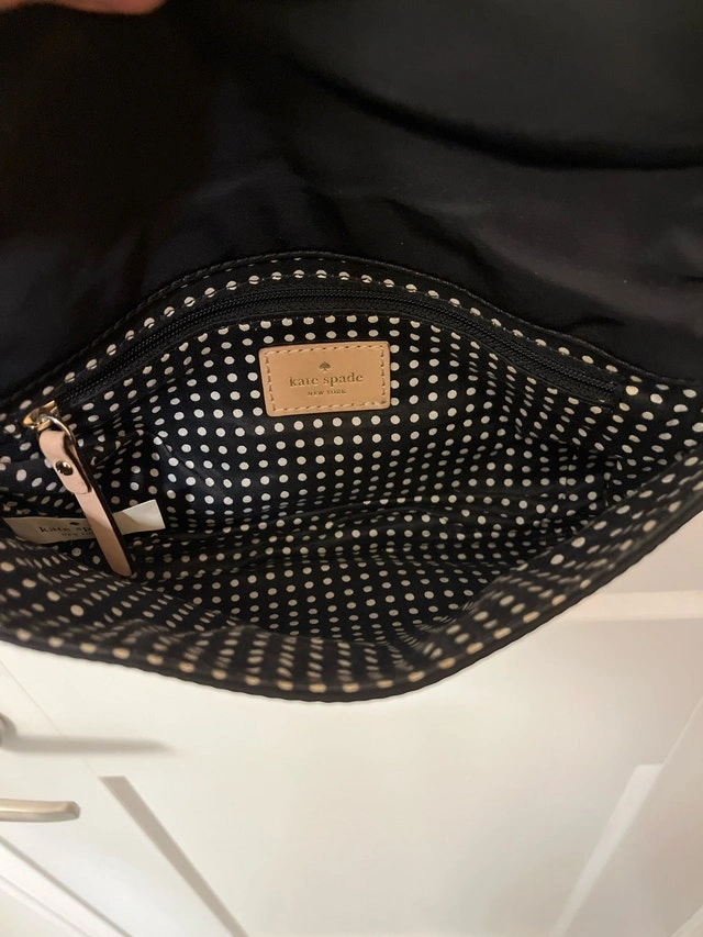 This is a stylish Kate Spade New York cross body bag crafted from durable black fabric with a tan-coloured adjustable strap and a polka dot interior lining. This bag is in good condition, showing some signs of wear, but is still a fashionable and functional accessory. Here are some additional details: