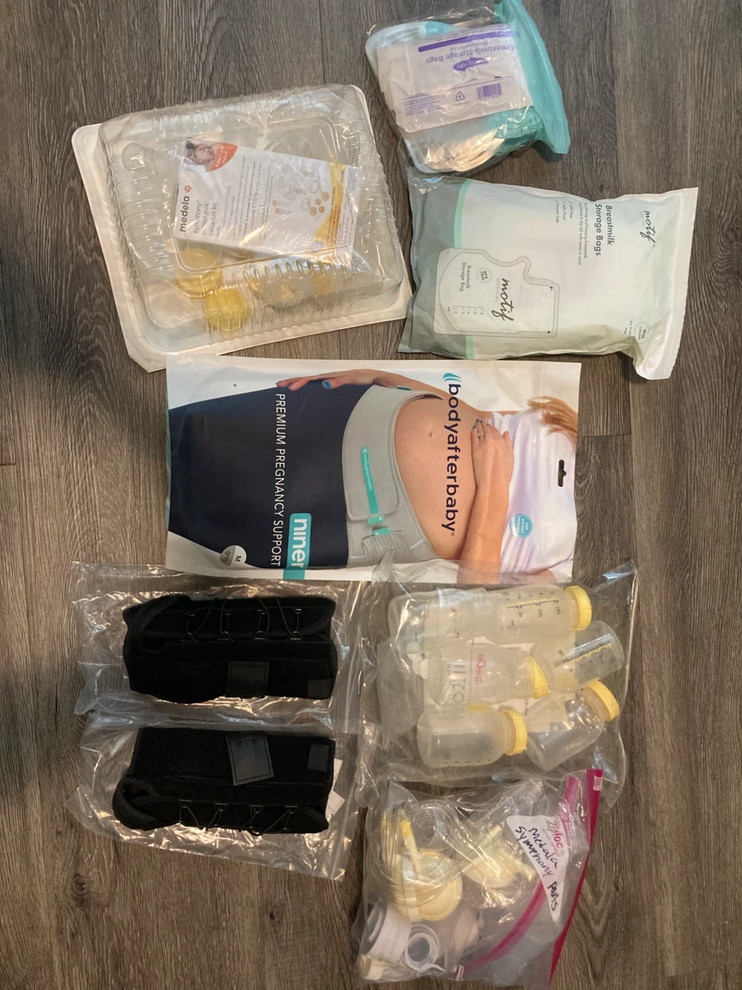 This lot includes Medela Symphony breast pump parts and accessories. It also comes with Motif breastmilk storage bags and a Body After Baby pregnancy support belt. Multiple bottles and pump parts are included.