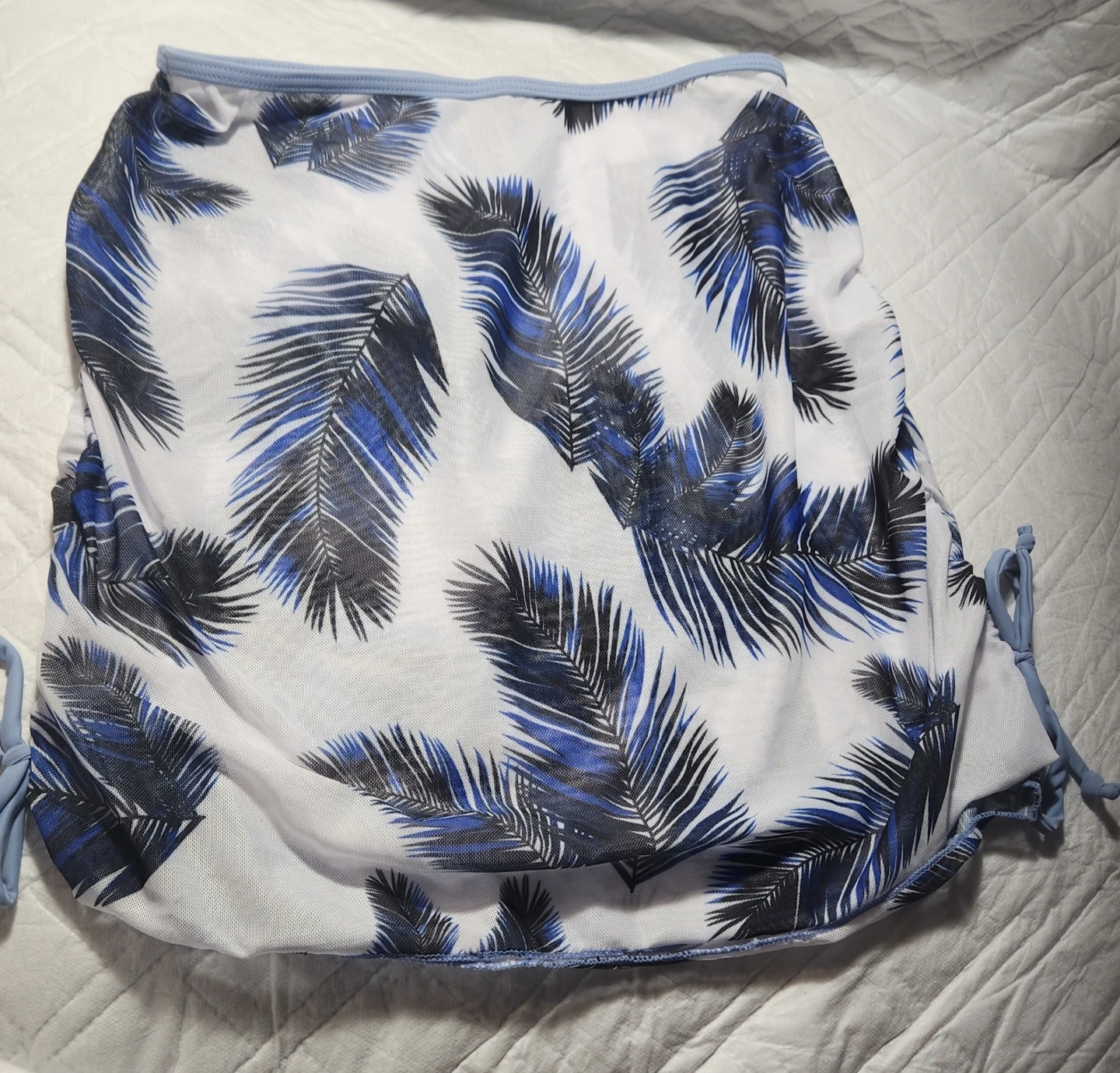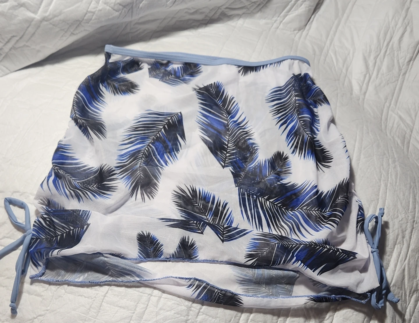 Lightweight sheer fabric with a blue and black palm leaf print. Features adjustable drawstring sides for a customizable fit. Perfect for layering over swimwear!