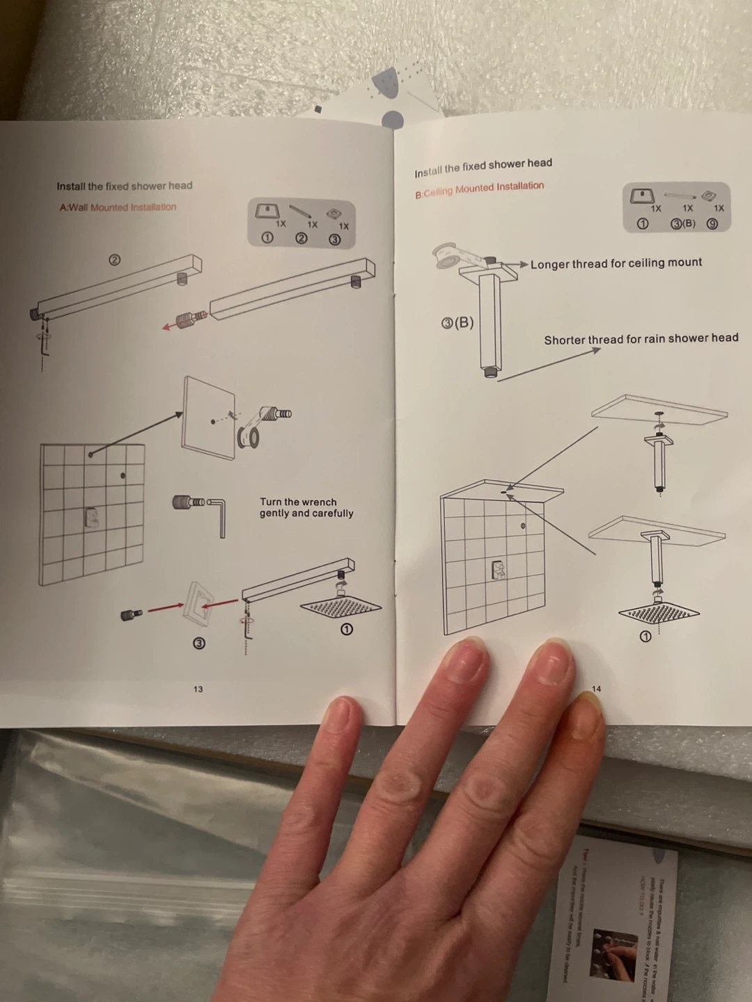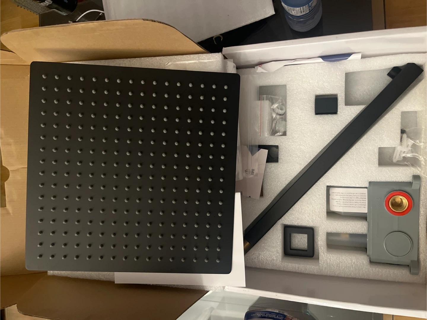 Brand new, in box. All pieces new. Great for Reno. Luxury dual shower heads; the large square one in the photo, and on option for an additional wall attachment included.