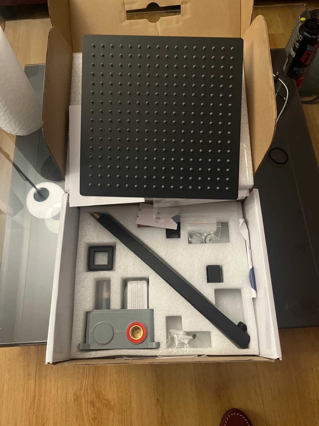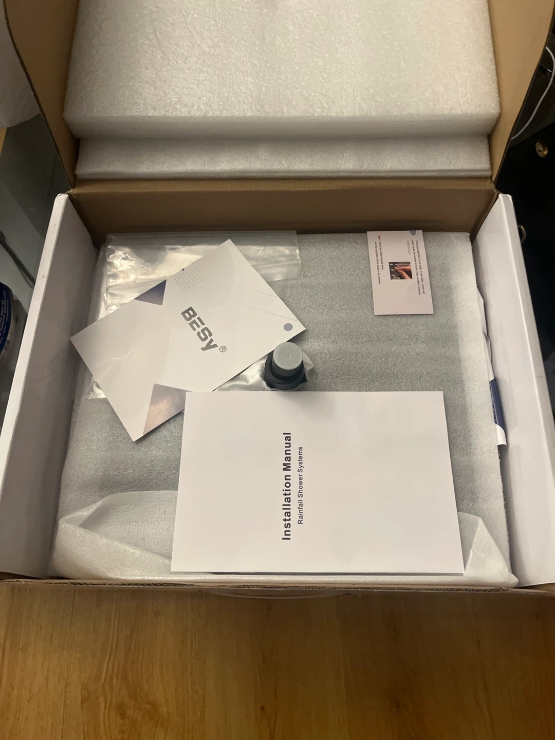 This is a BESY black square rain shower head system. It includes a rain shower head, shower arm, and installation hardware. Installation manual is included. It's made of durable material for long-lasting use.