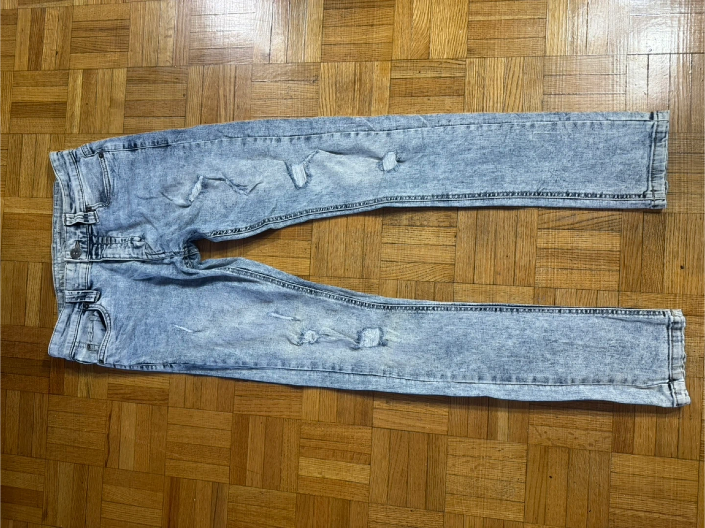 Light blue acid wash denim jeans with distressed rips. Classic five-pocket style. These jeans offer a modern distressed look.