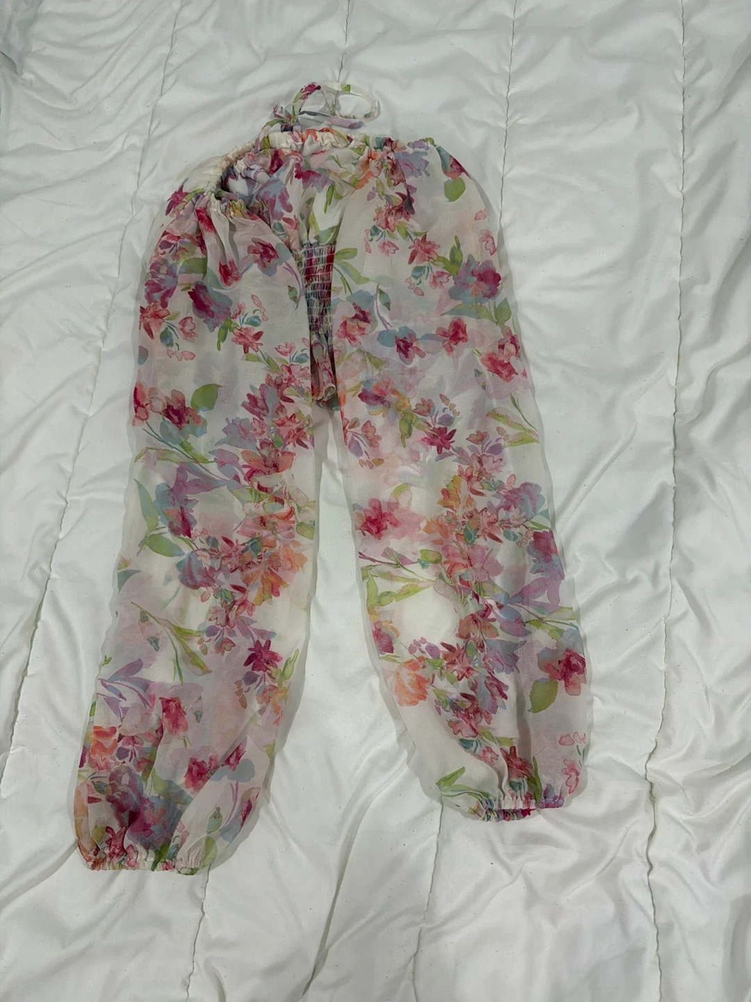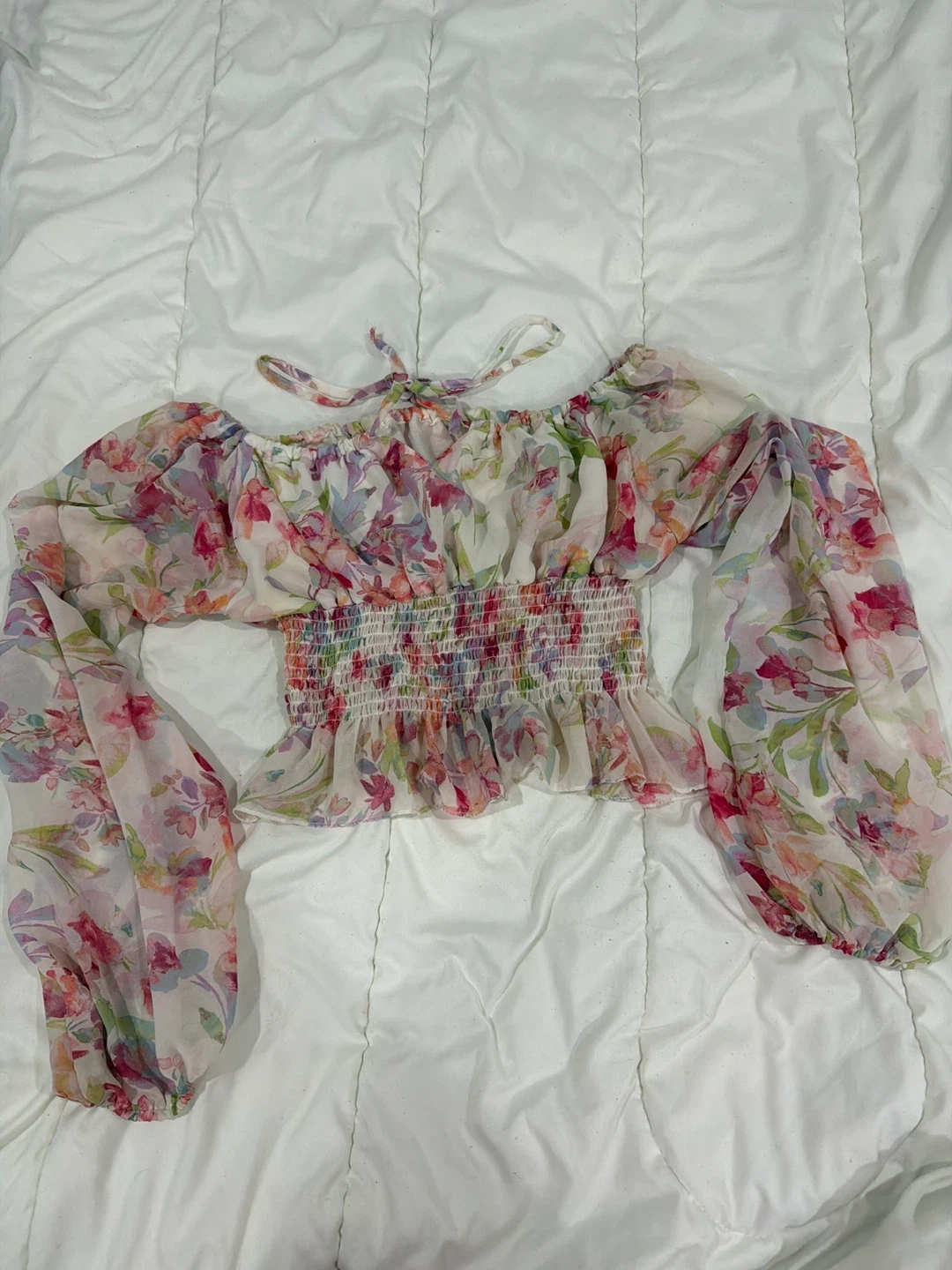 This is a beautiful floral print blouse. It has a tie at the neck and elastic at the waist. The sleeves are long and flowy. The material is lightweight and perfect for summer