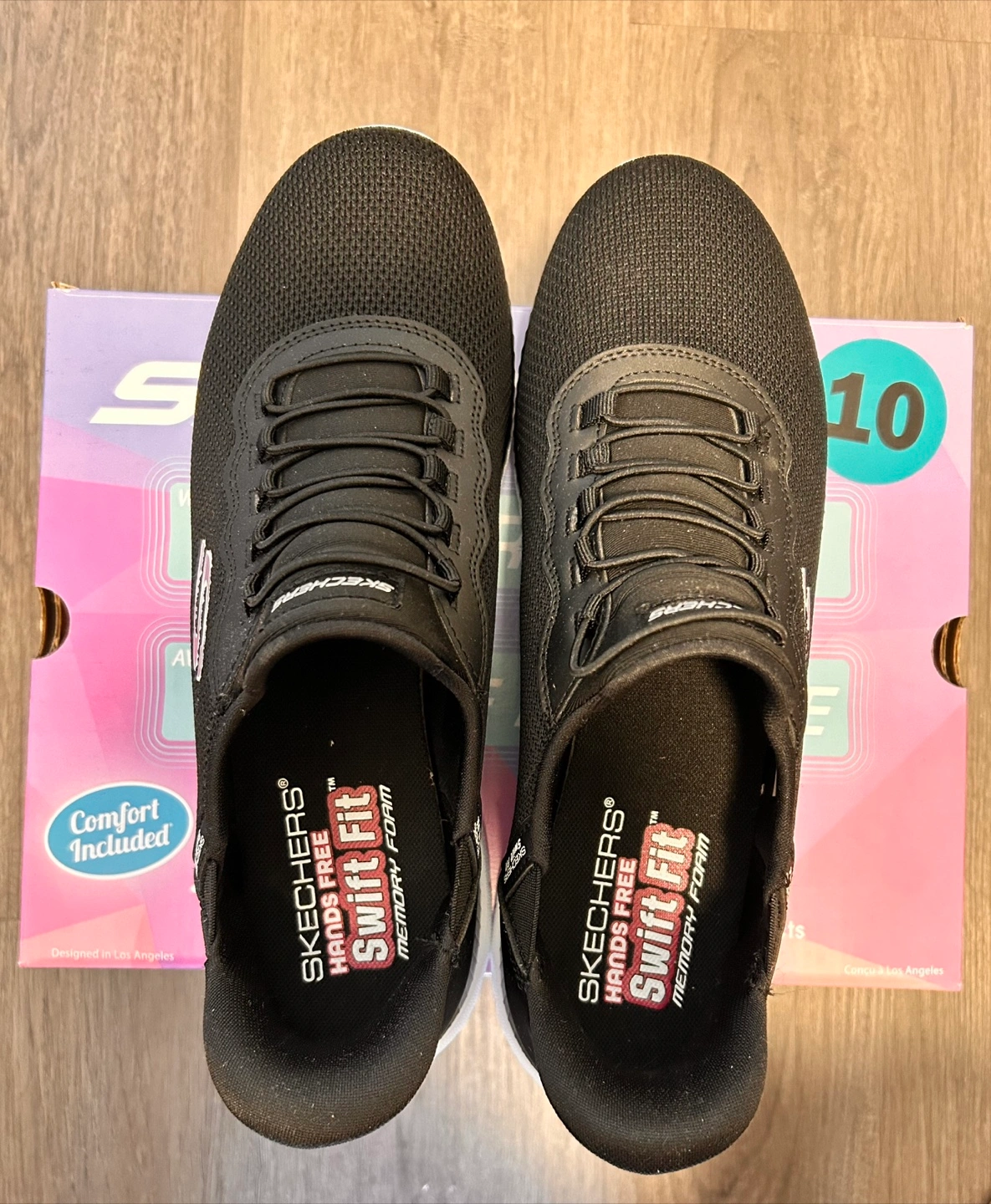 Selling a pair of Skechers Hands Free Slip-ins with Swift Fit memory foam! They are black and a size 10. The box is included, featuring comfort and impact absorption. These shoes contour to your foot for a great fit.