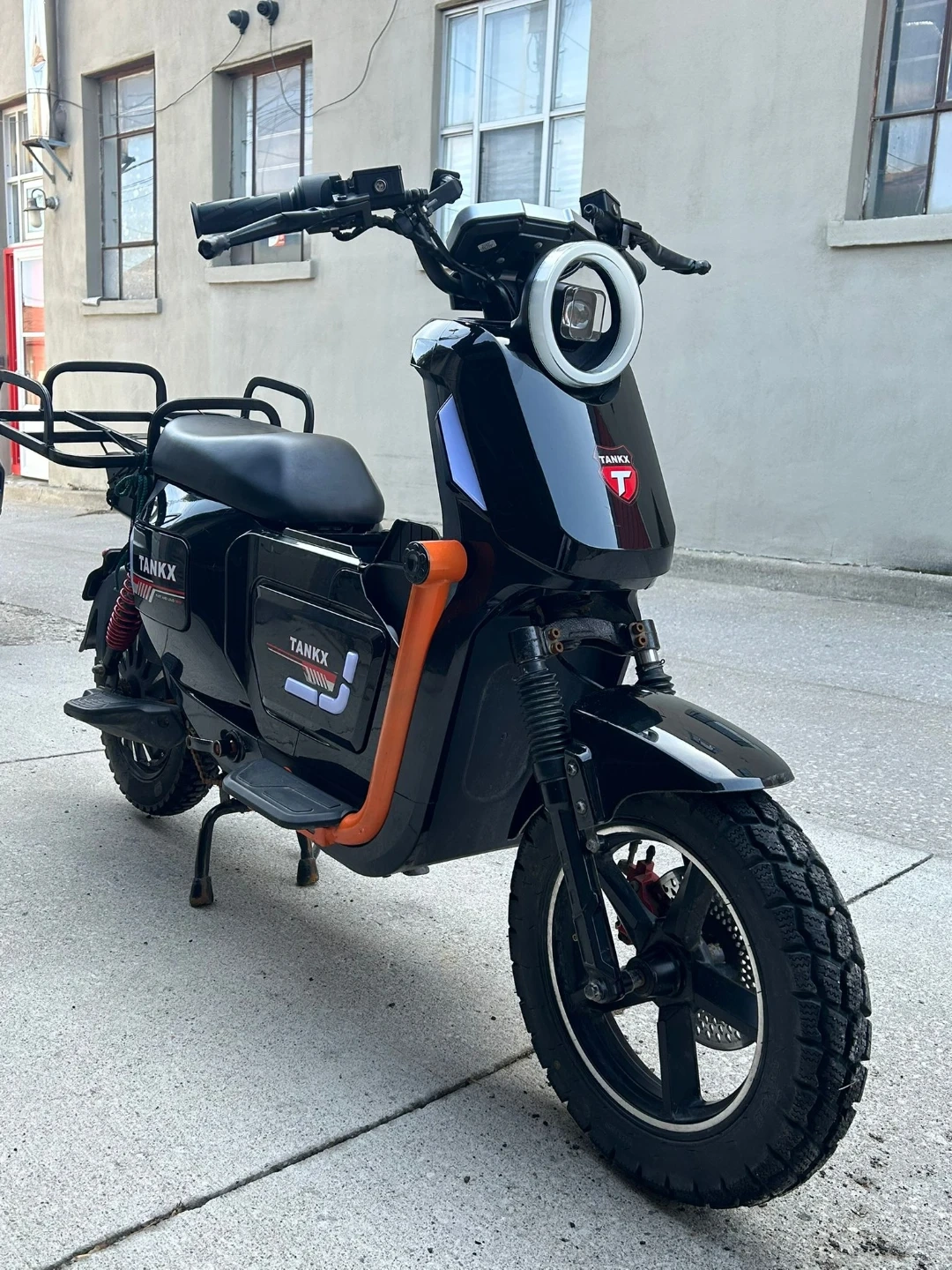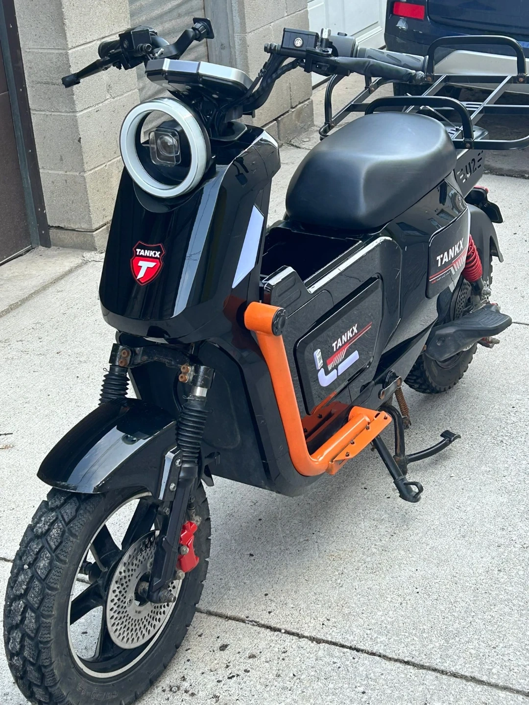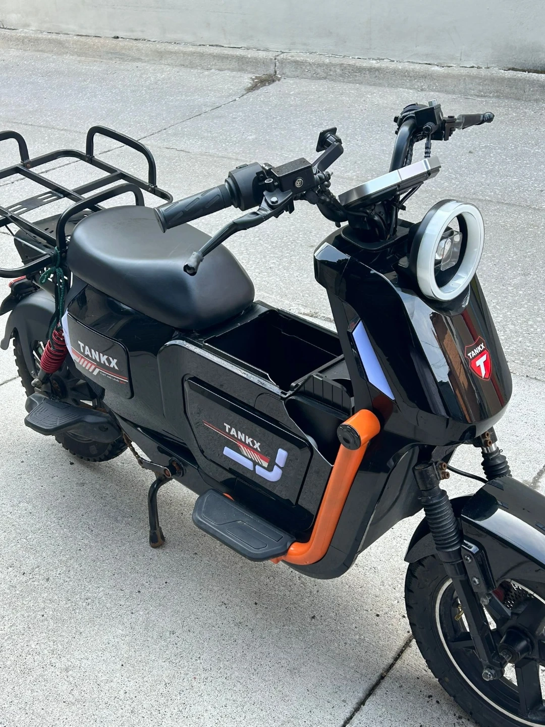 This is a black TANKX electric scooter. It features an orange frame accent and a rear cargo rack. Perfect for quick trips around town!