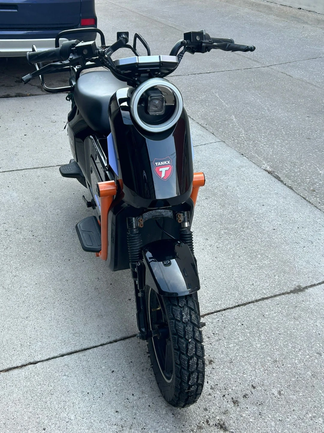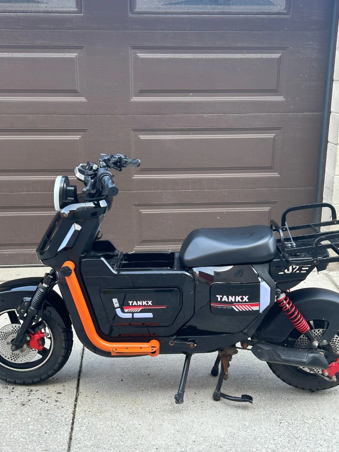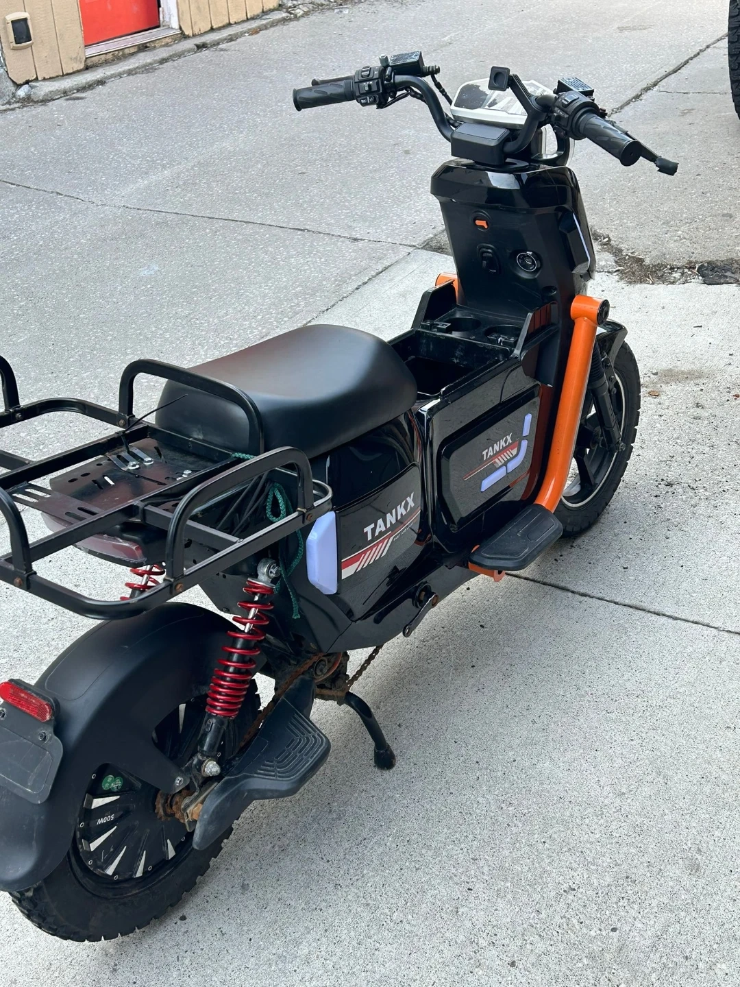 This is a black TANKX electric scooter. It features an orange frame accent and a rear cargo rack. Perfect for quick trips around town!