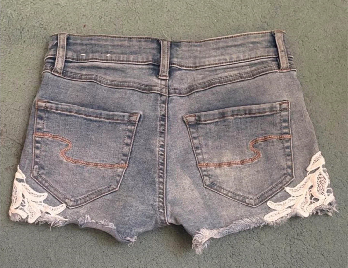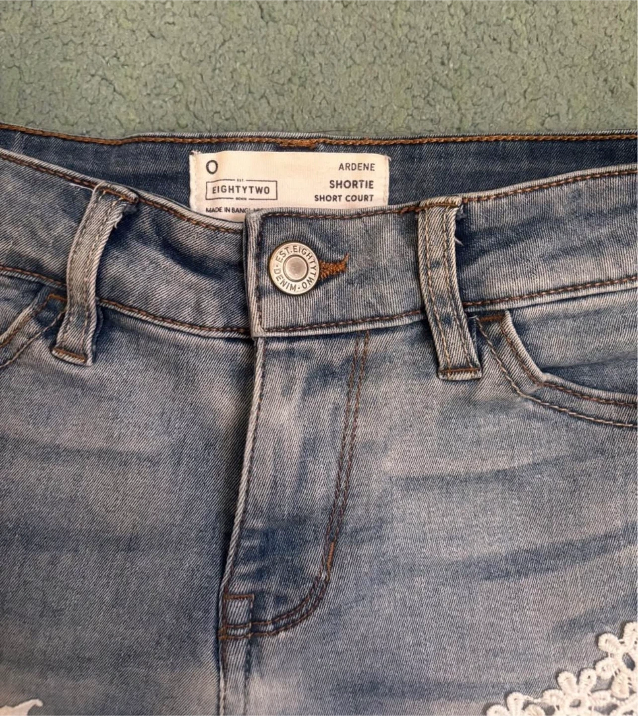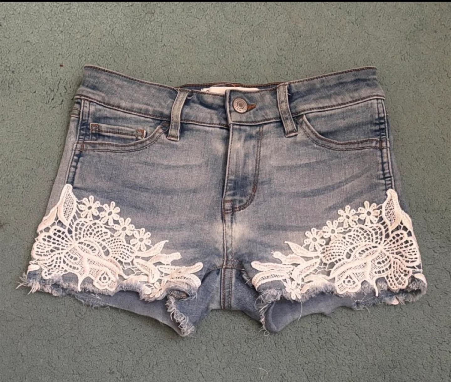 These low rise Y2K denim shorts feature white lace detailing. They fit size 00 and are perfect for summer!