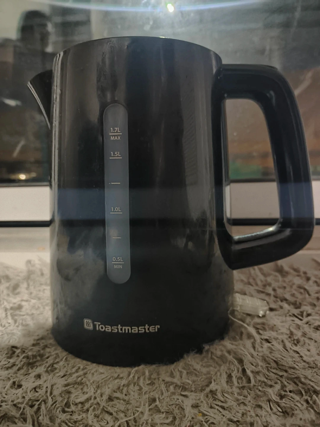 This is a black electric kettle from Toastmaster. It has a maximum capacity of 1.7L and a minimum fill line of 0.5L. It's great for quickly heating water for tea or coffee.