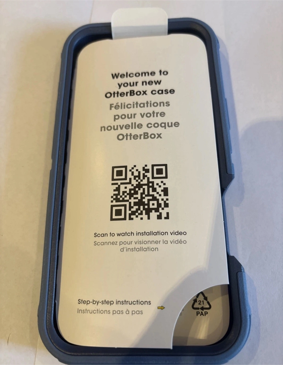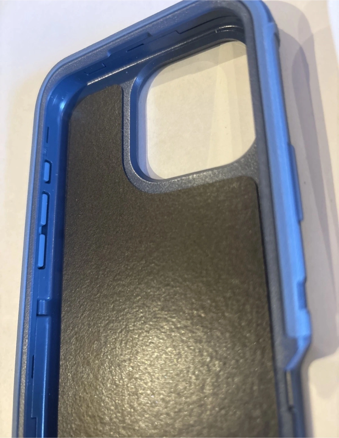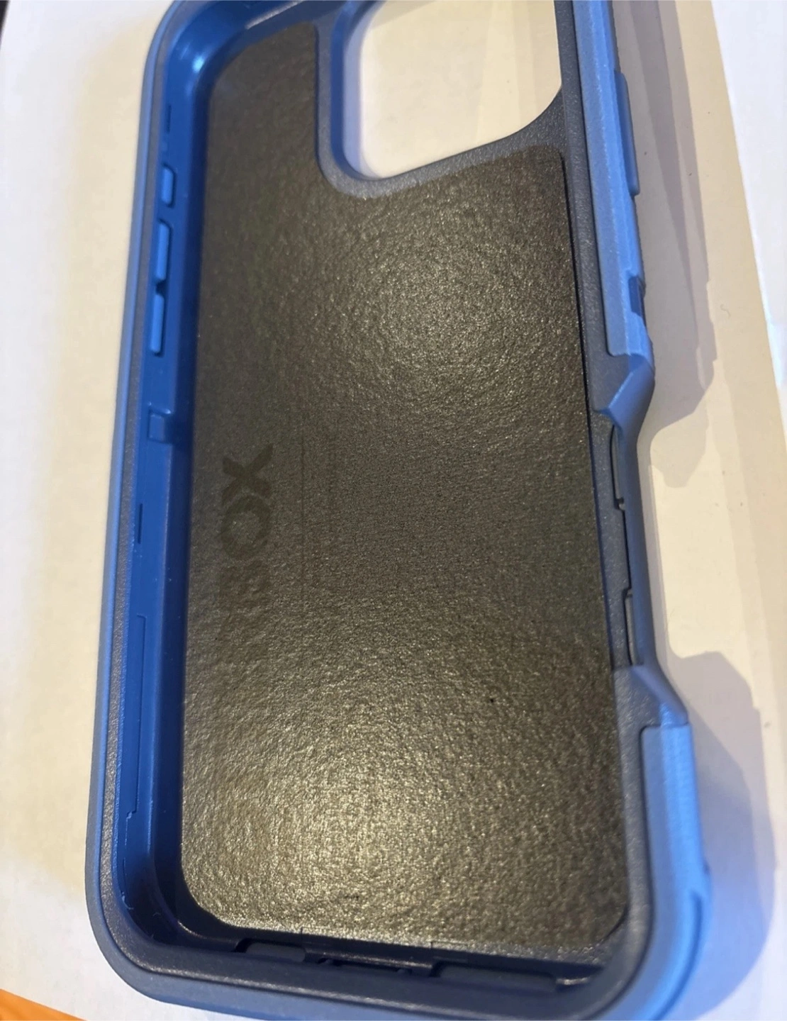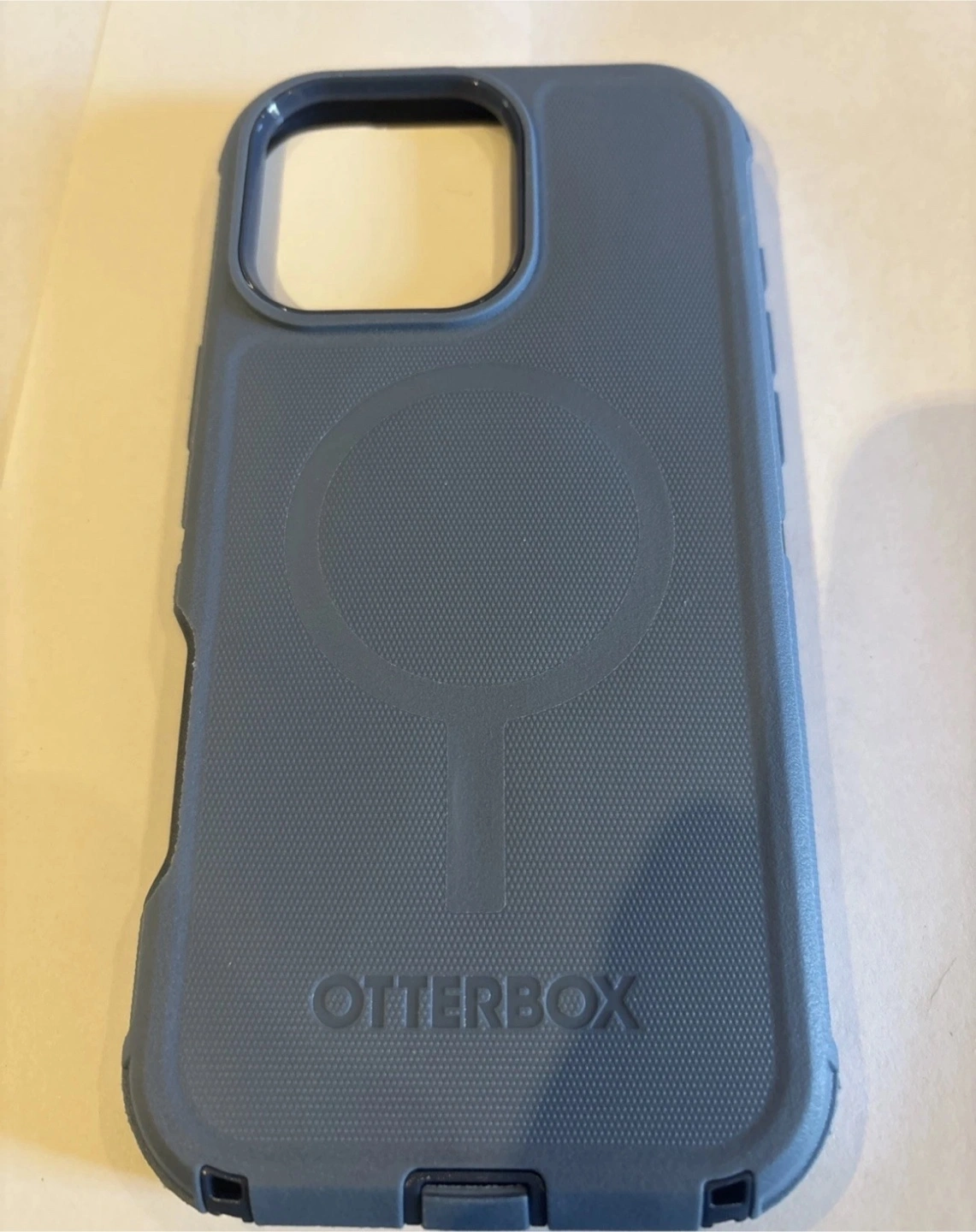 Blue-toned phone case. Made for the phone's protection. There is a circular marking on the back. A practical item for any phone user.