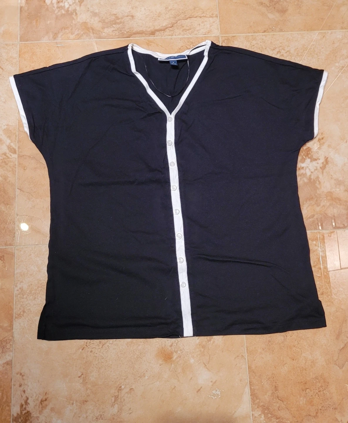 This is a Karen Scott t-shirt in black with white trim and white buttons. It's a size medium. It features short sleeves and a v-neckline with a button-up front. A nice casual top!