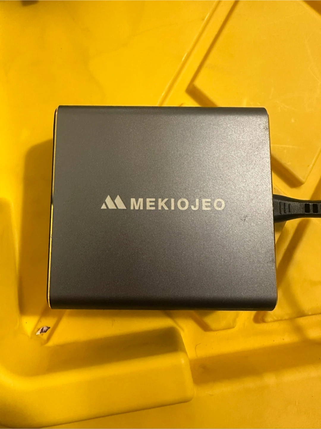 This is a MEKIOJEO 260W USB C charger. It features GaN technology for multi-device charging. The shell is made of aluminum alloy.