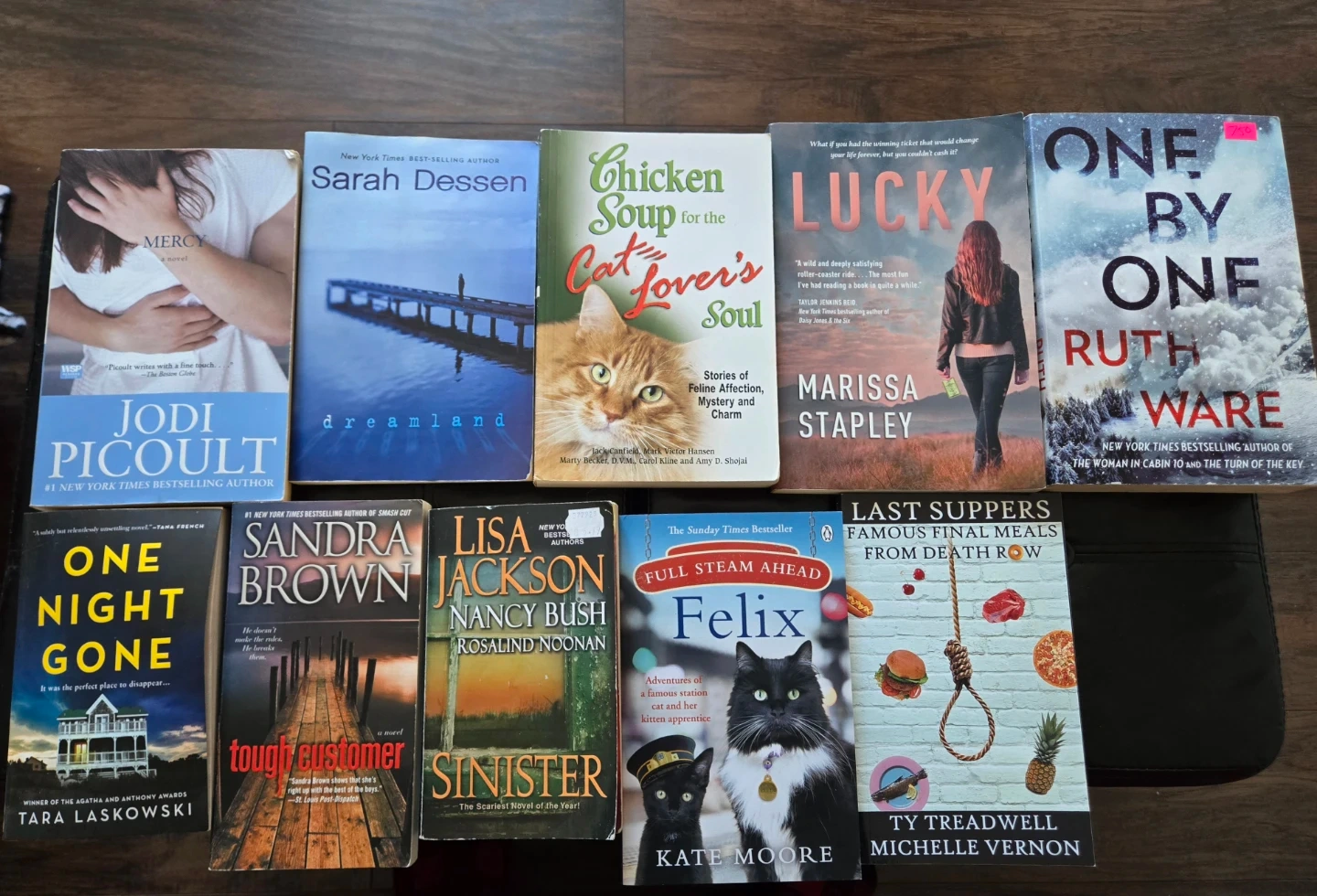 This is a collection of 9 paperback novels. It includes titles by Jodi Picoult, Sarah Dessen, Sandra Brown, Lisa Jackson, Nancy Bush, Rosalind Noonan, Marissa Stapley, Ruth Ware, and more. The books cover various genres including mystery, thriller, and general fiction. Great for any avid reader!