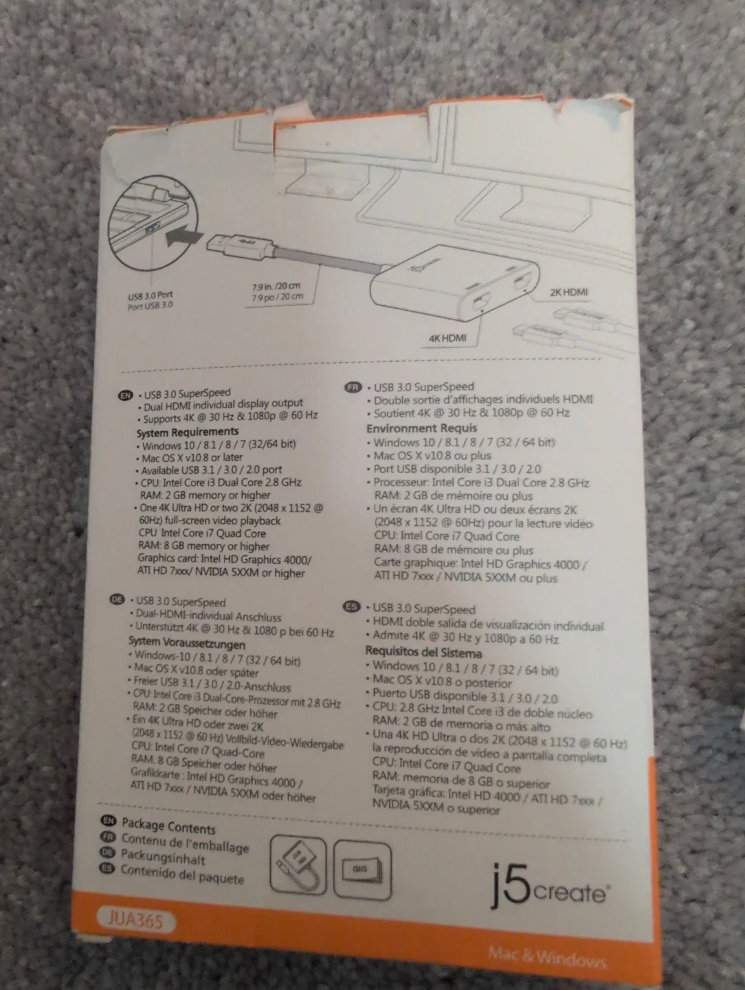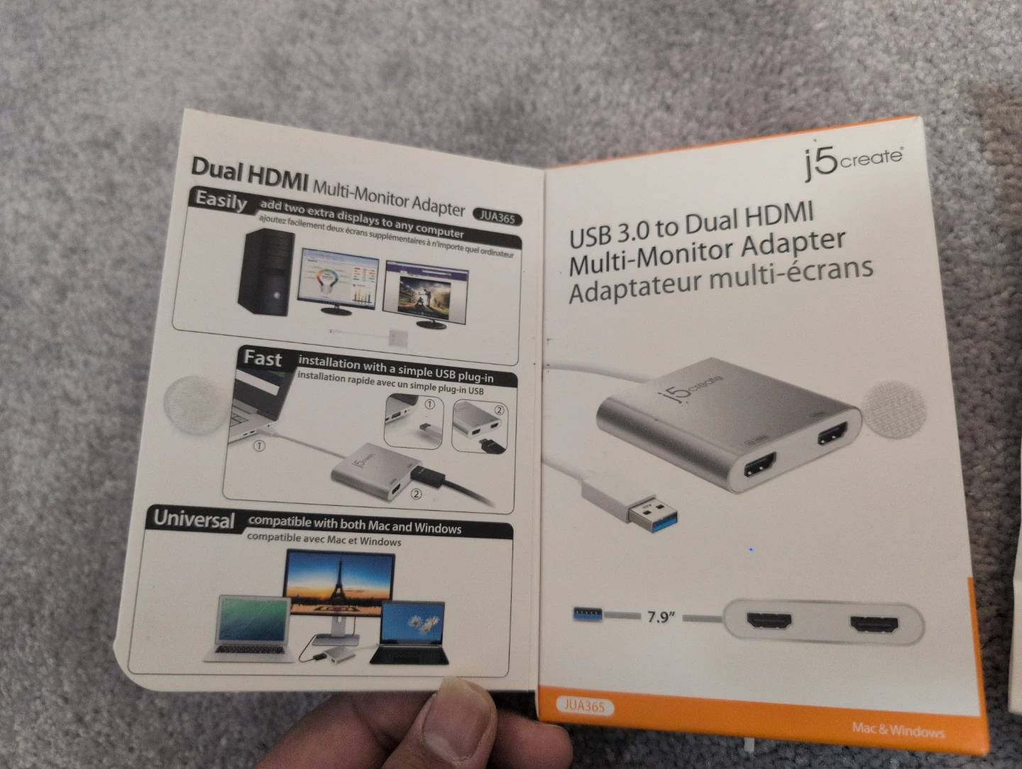 Selling a j5create USB 3.0 to Dual HDMI Multi-Monitor Adapter (model JUA365). It's compatible with both Mac and Windows and allows you to add two extra displays to any computer. The box is included!