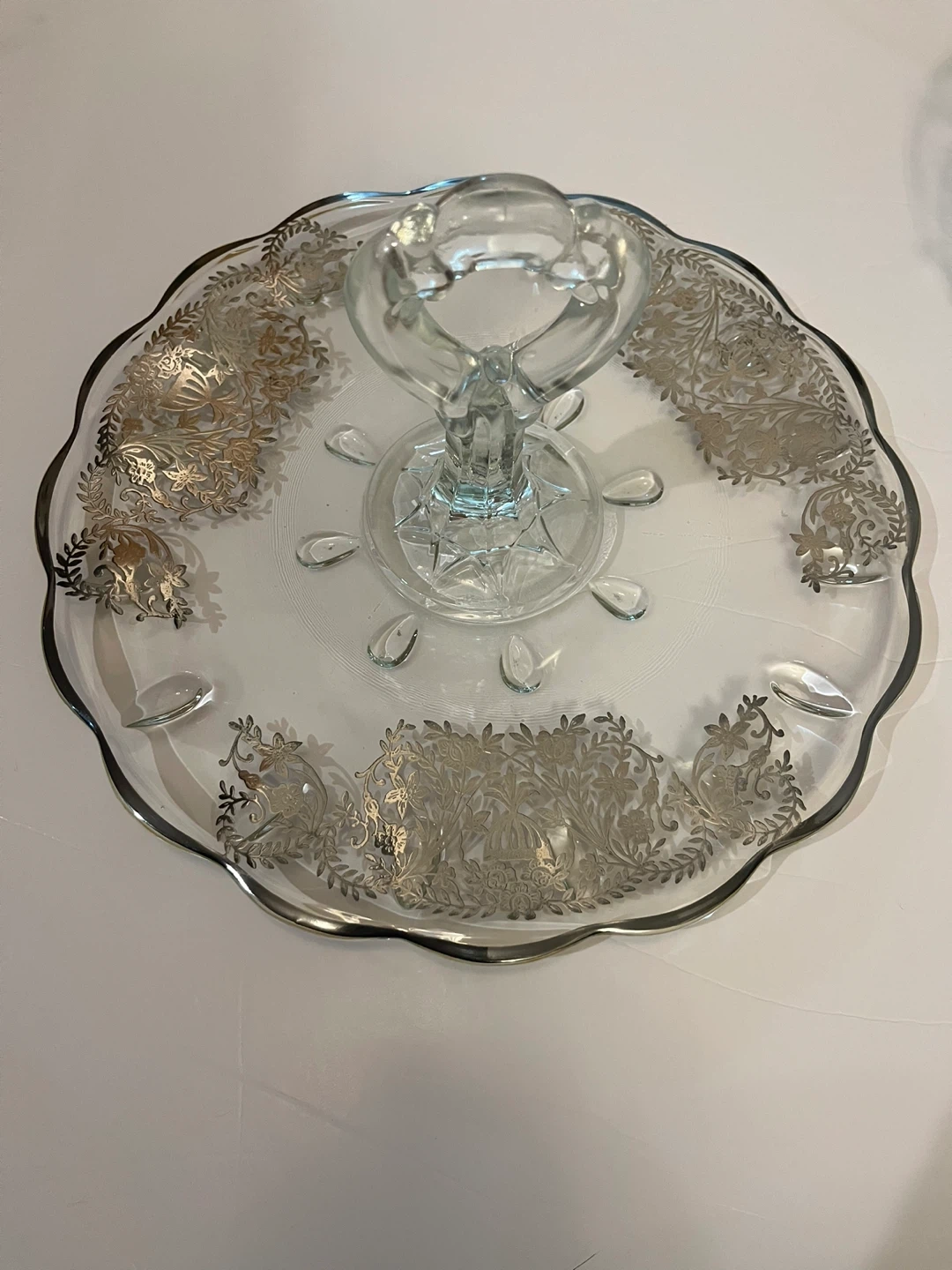 This clear glass serving tray has a decorative silver floral pattern along the scalloped edge. It's raised on a clear glass pedestal with a handle for easy carrying. Perfect for serving desserts or appetizers!