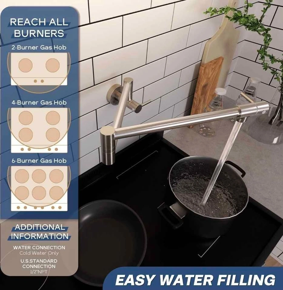 The design features 360° rotation and dual joint swing arms for quick and easy pot filling. The dual-handle, dual-valve design allows you to control water flow with either handle, and the high-performance faucet aerator ensures stable, splash-free water flow. After use, close both handles and fold the arms back to save space.