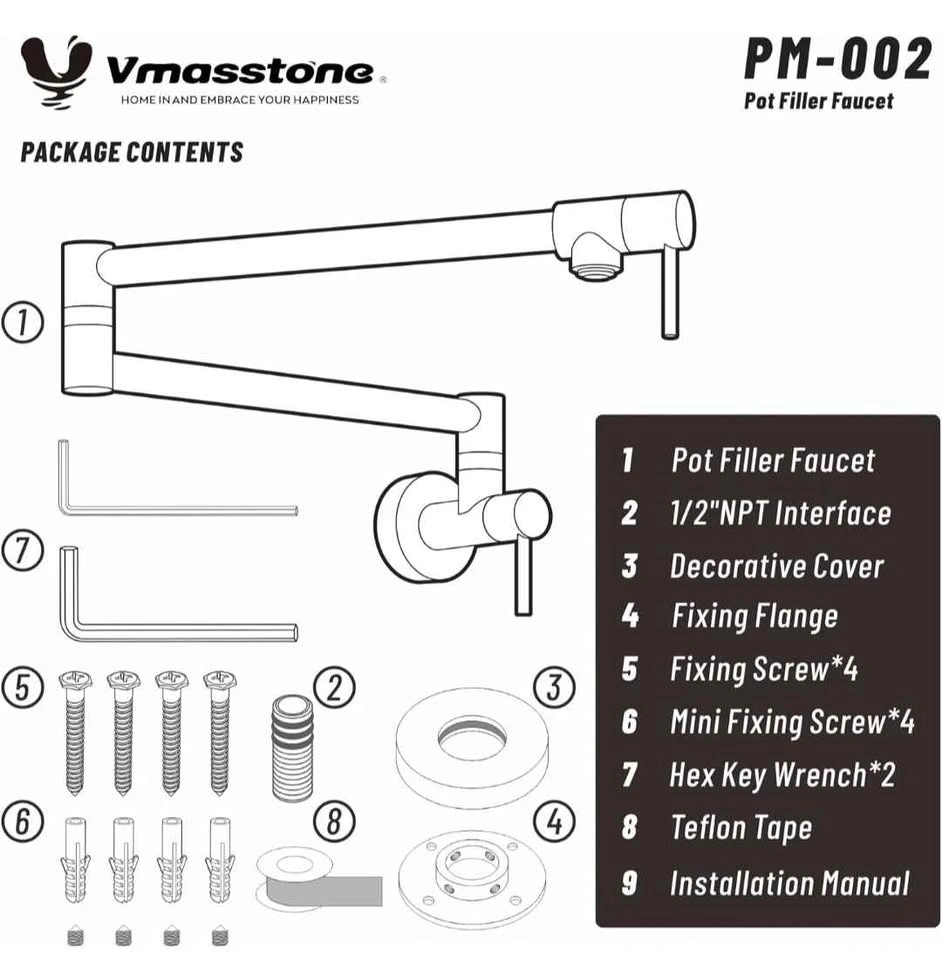 The VMASSTONE PM002 Pot Filler Faucet is made from premium solid brass, ensuring safe drinking water. Compared to stainless steel, brass offers superior heat and pressure resistance, providing lasting durability and stability.