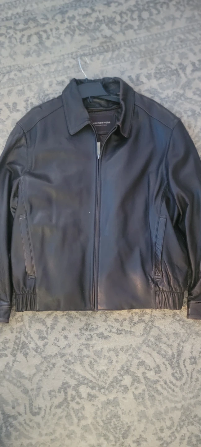 Marc New York black leather bomber jacket. It's a men's size XL with a zip-up front and elasticized cuffs and hem. Made from genuine leather.