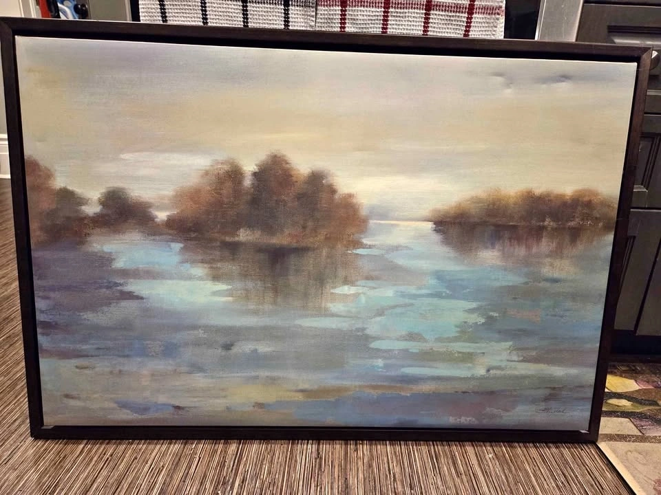 Beautiful framed canvas art. Abstract landscape painting with muted blue, gray, and brown tones. Features a serene river or lake scene with trees. Dark frame. Minor imperfections as shown in pictures. Pick up in Niagara Falls.