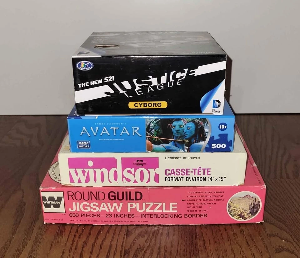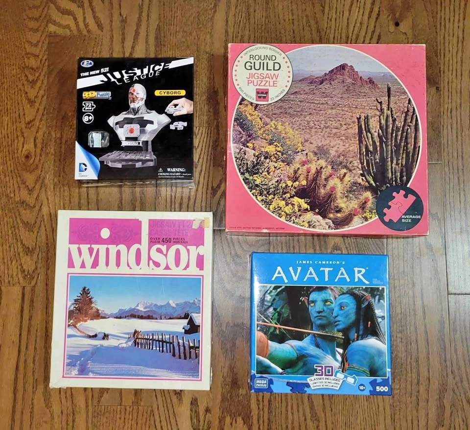 Four puzzles in great condition, no pieces missing. The Avatar puzzle was only used once and the Justice League puzzle is brand new in box. Individual pricing is negotiable: Justice League: Cyborg 3D puzzle (72 pcs) = $5, Avatar puzzle w/ 3D glasses (500 pcs) = $5, Organ Pipe Cactus National Monument, Arizona puzzle (650 pcs) = $5, Winters' Embrace puzzle (450 pcs) = $5. Take all four for $15.
