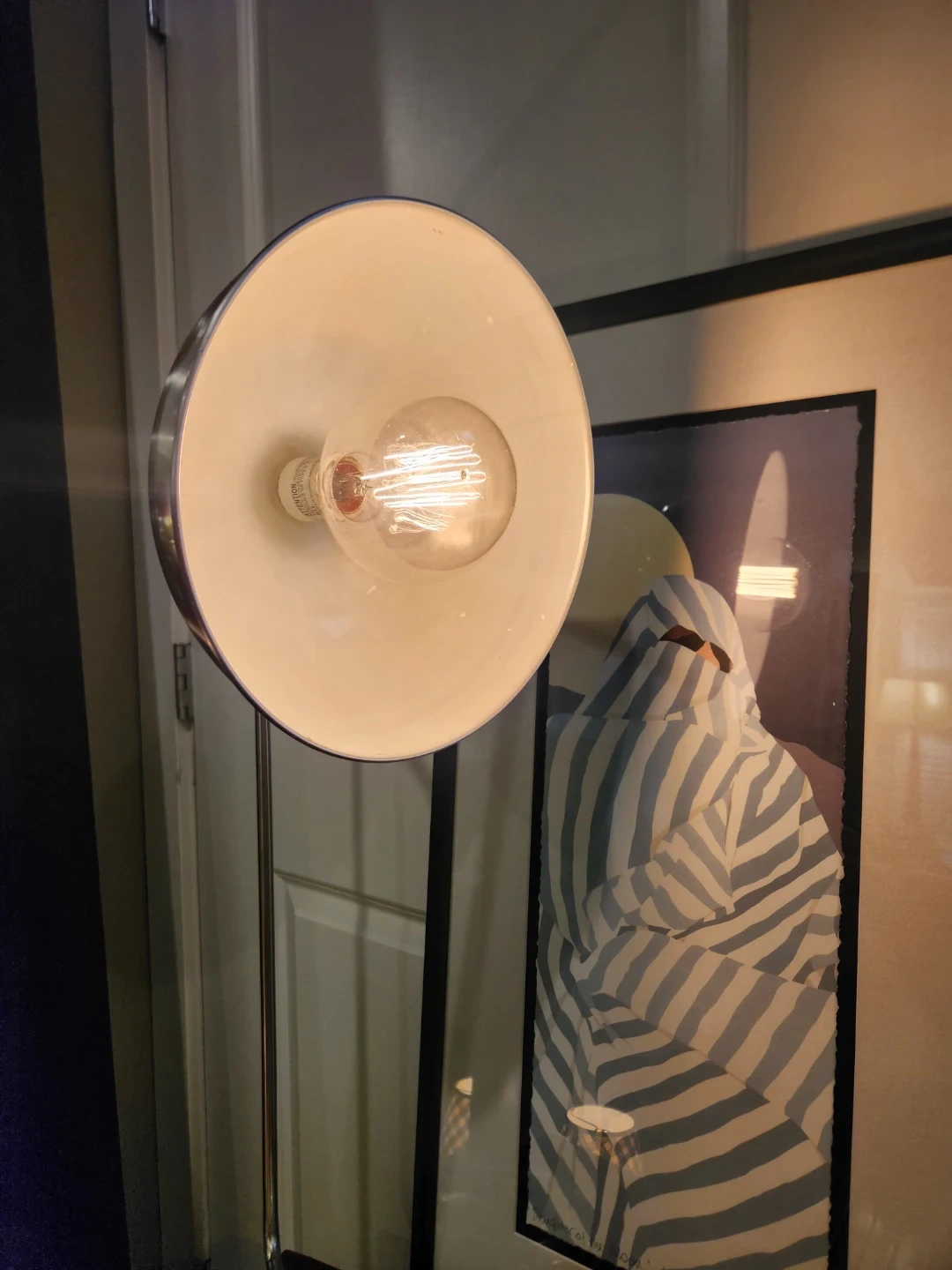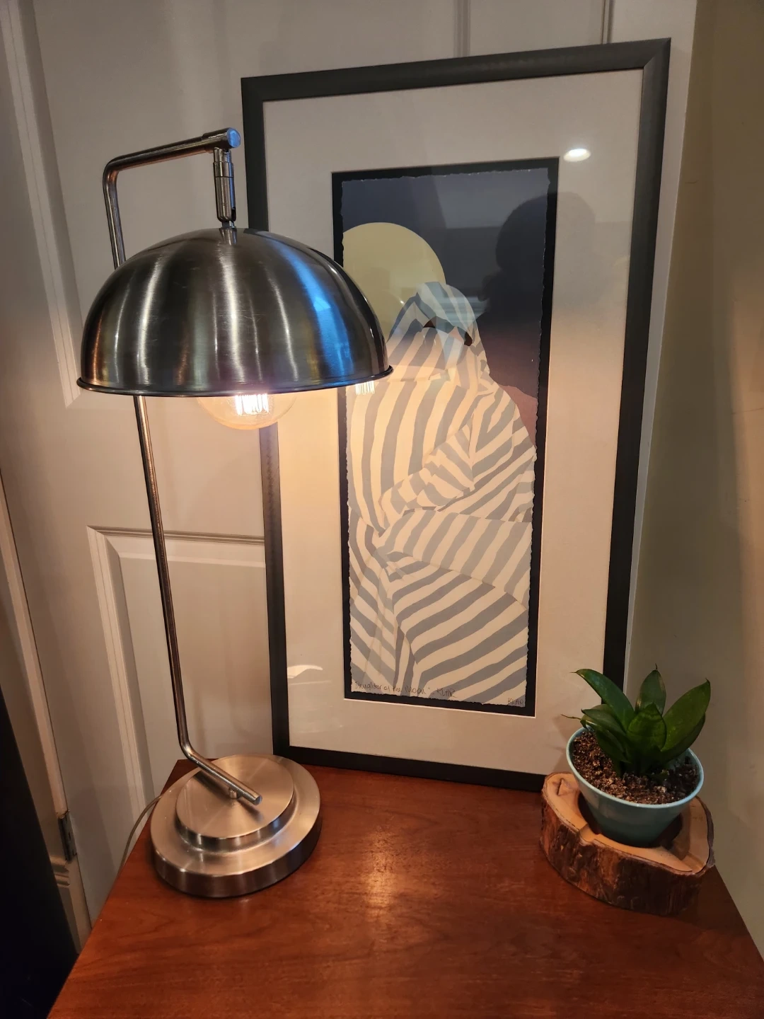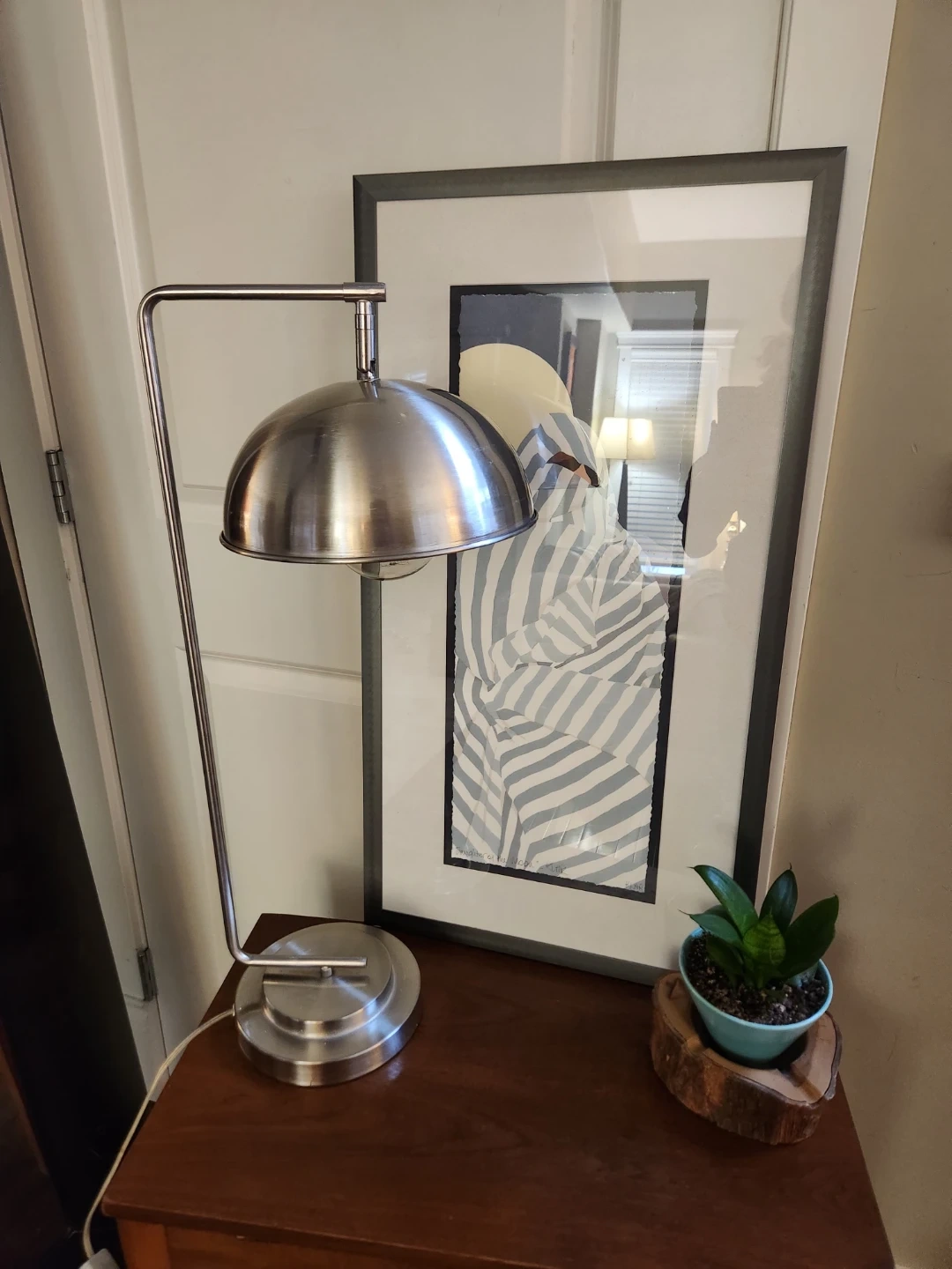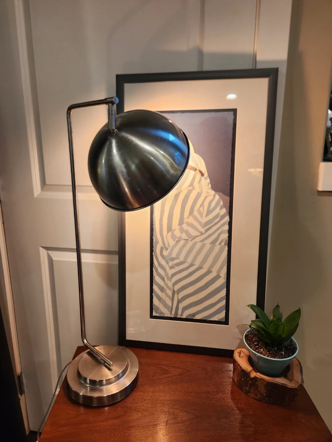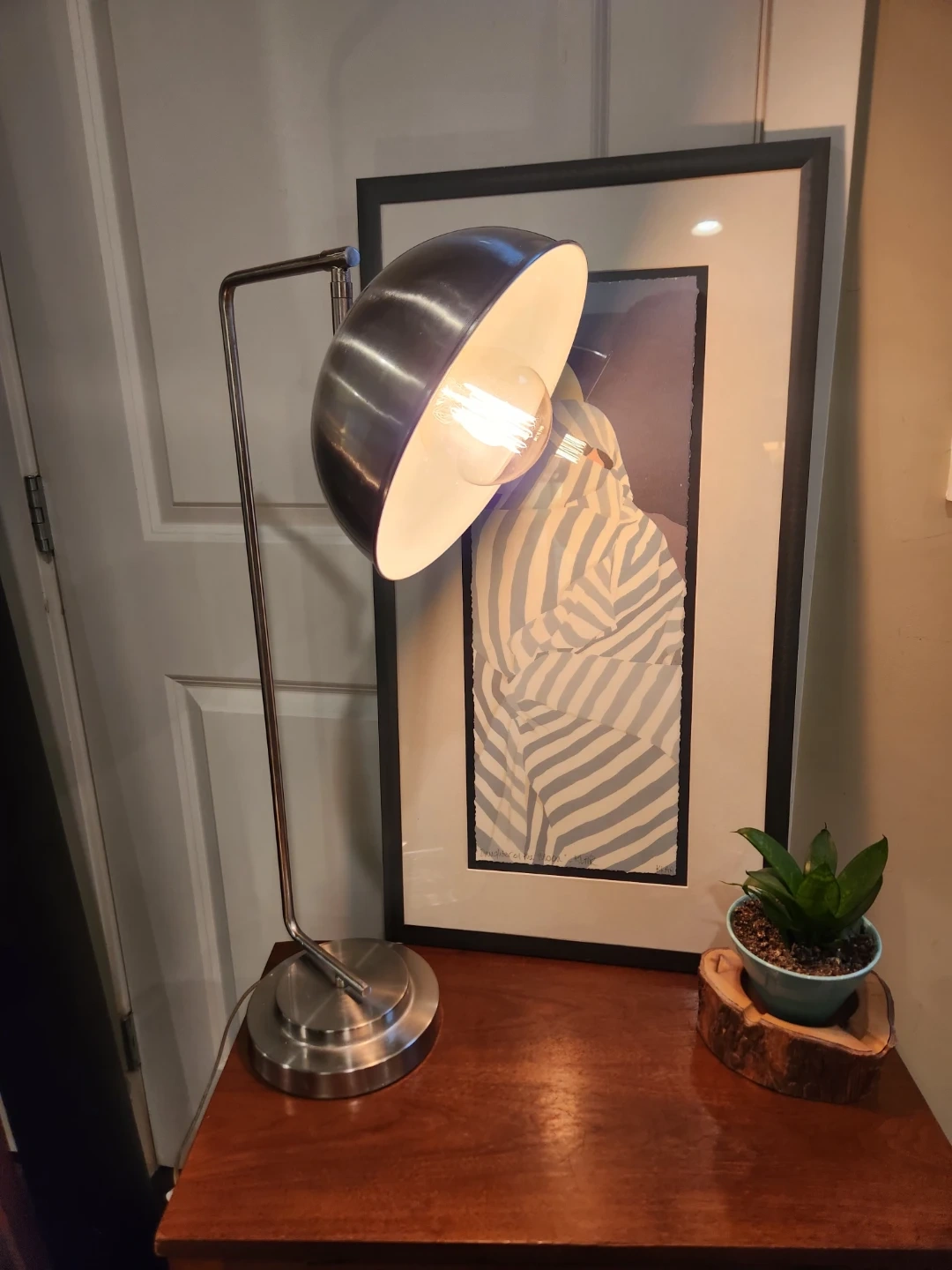 This modern sleek desk lamp, had a mid century modern vibe. Adjustable head design, allow you room light feature plants, art, or projects! The metal dome shade directs light effectively. It's perfect for illuminating your workspace or a reading nook. 27 inches high, with a 8 inch diameter base and a 10 inch diameter lamp head