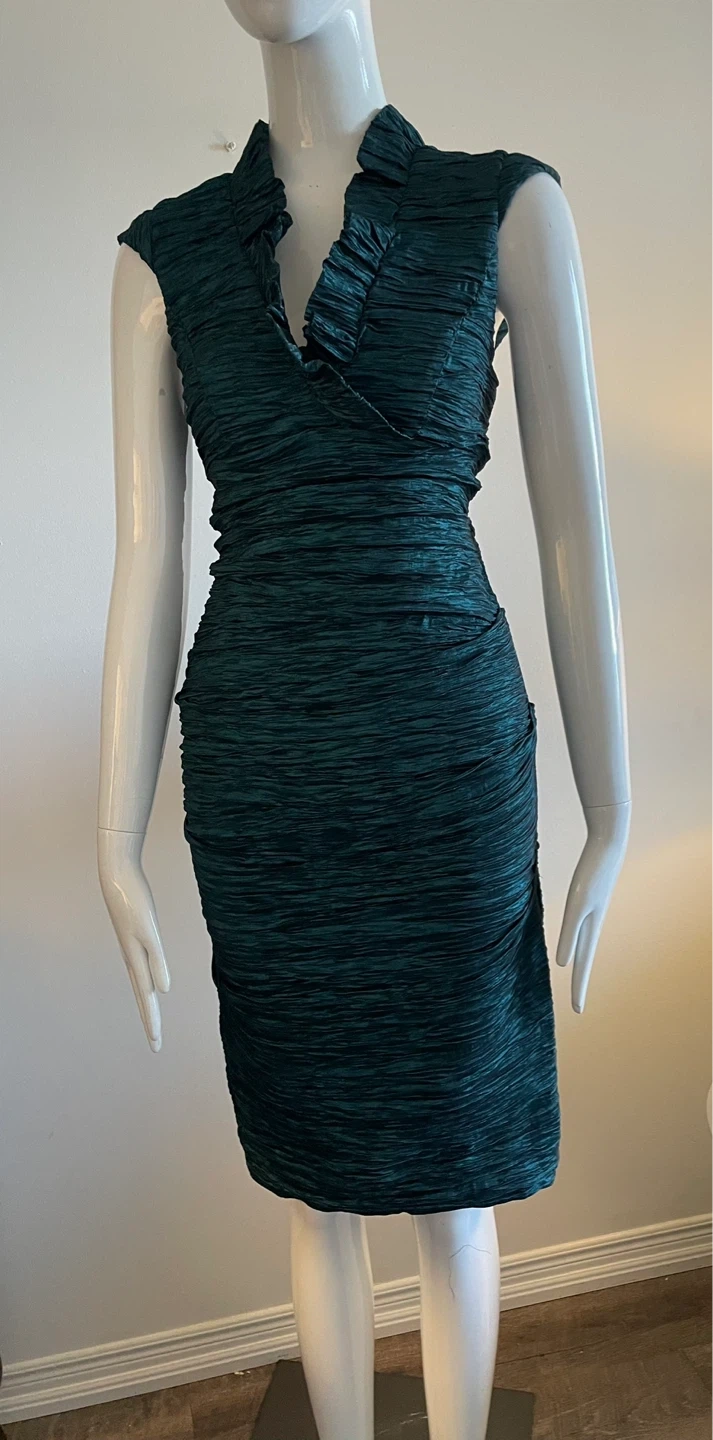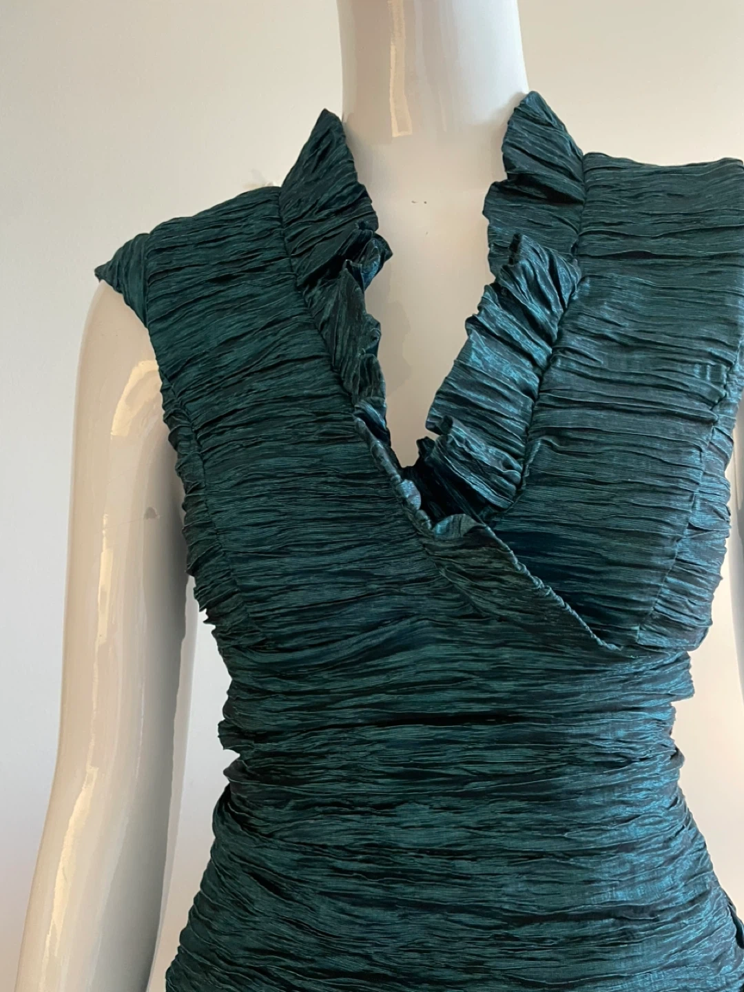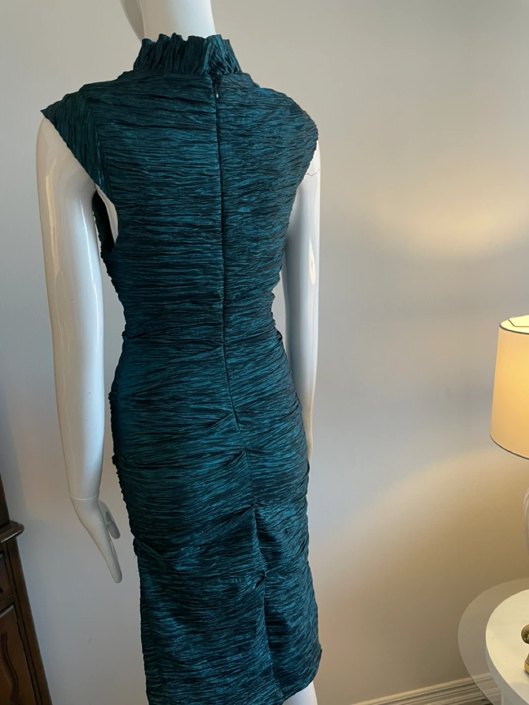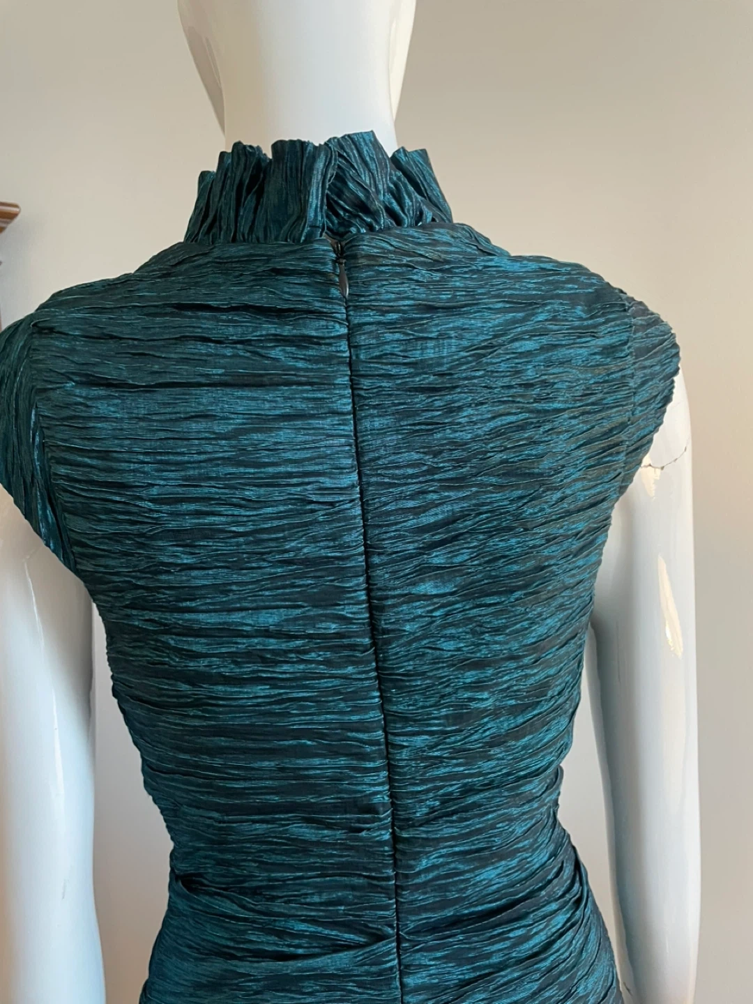 Sleeveless teal cocktail dress with a V-neckline and ruched detailing throughout. It has a high neckline with ruffles at the back. Zipper closure.