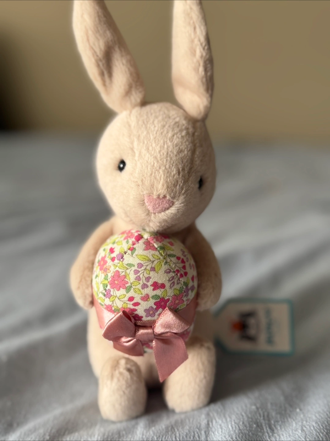This is a sweet Jellycat beige bunny plush toy holding a floral-patterned egg. The bunny's ears are soft and floppy, and it's adorned with a pink satin bow around the egg. It's a lovely little friend for Easter or any time! 100% real and 100% new with tag.