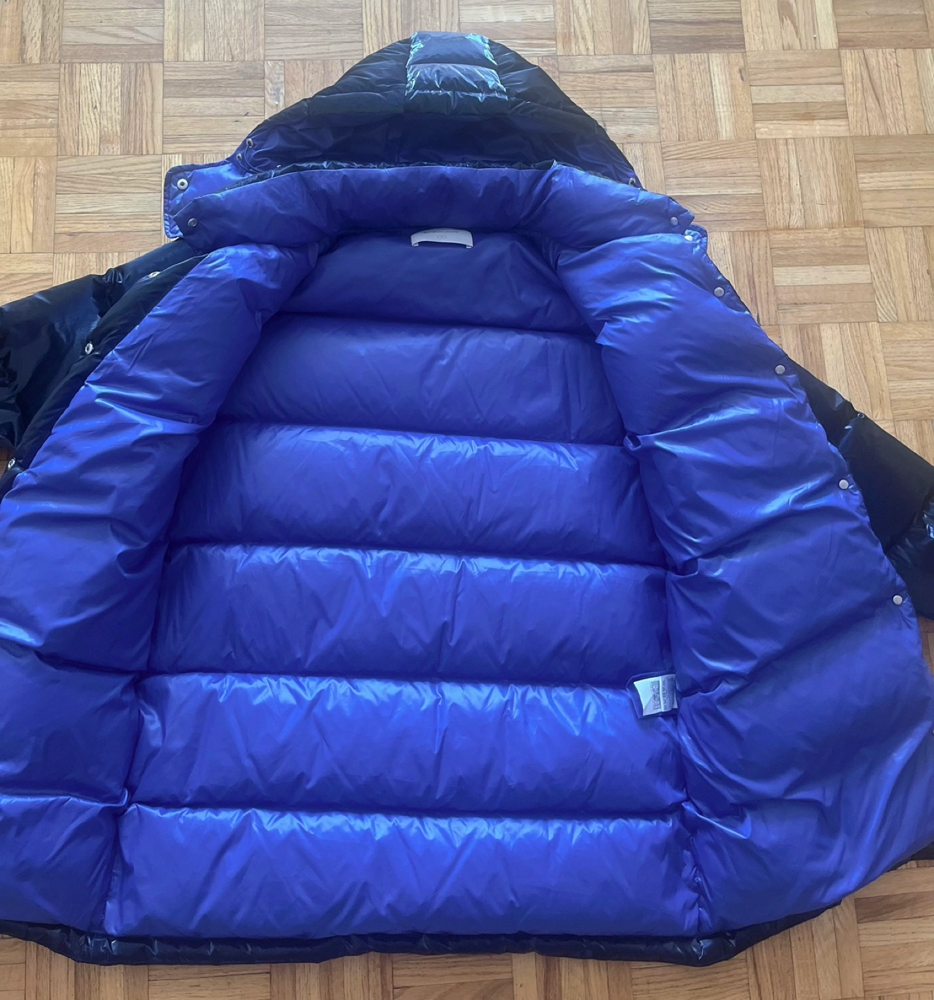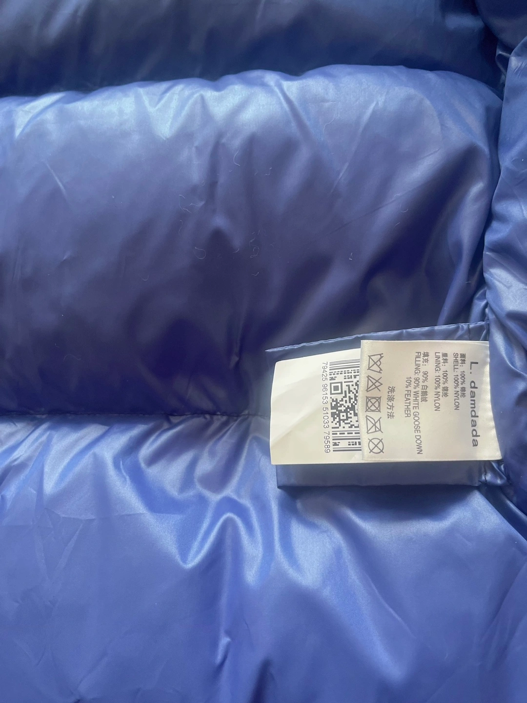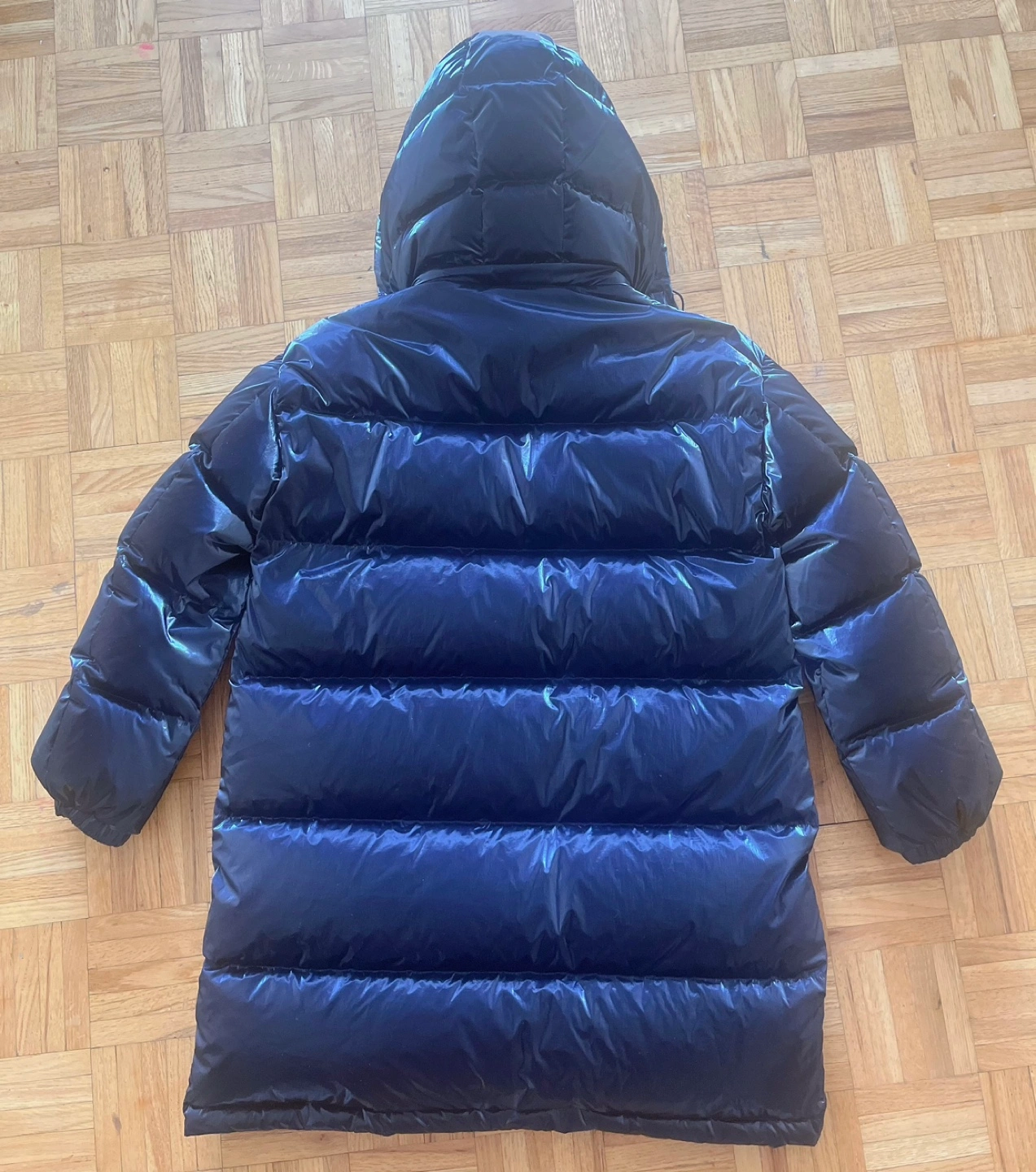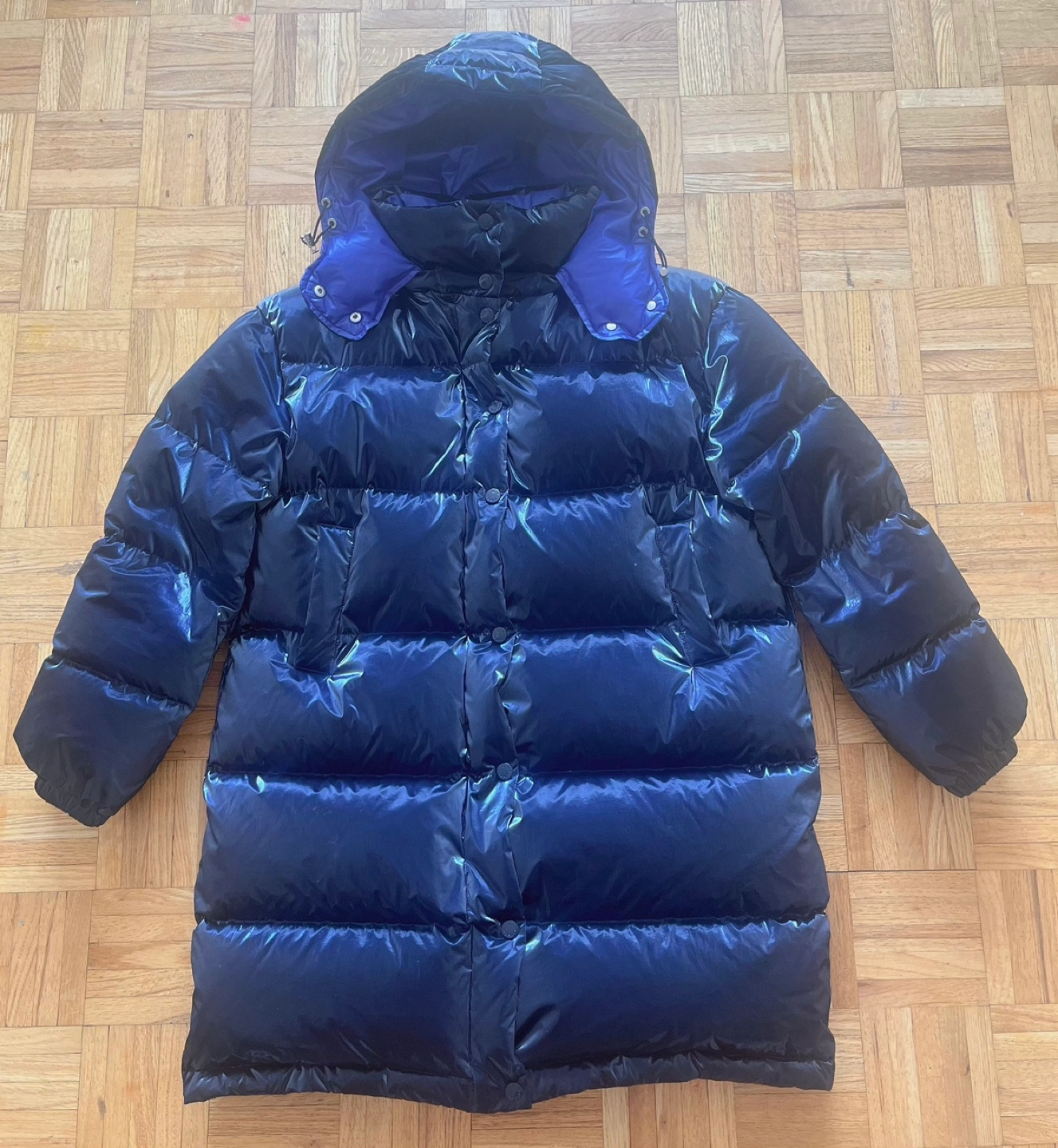 Medium to long goose down jacket. Shiny dark blue exterior. Blue interior. Snap closures. The hat of the down jacket can be removed. Chest circumference 116cm, clothing length 88.5cm.Only worn once.Excellent condition.Cash only.