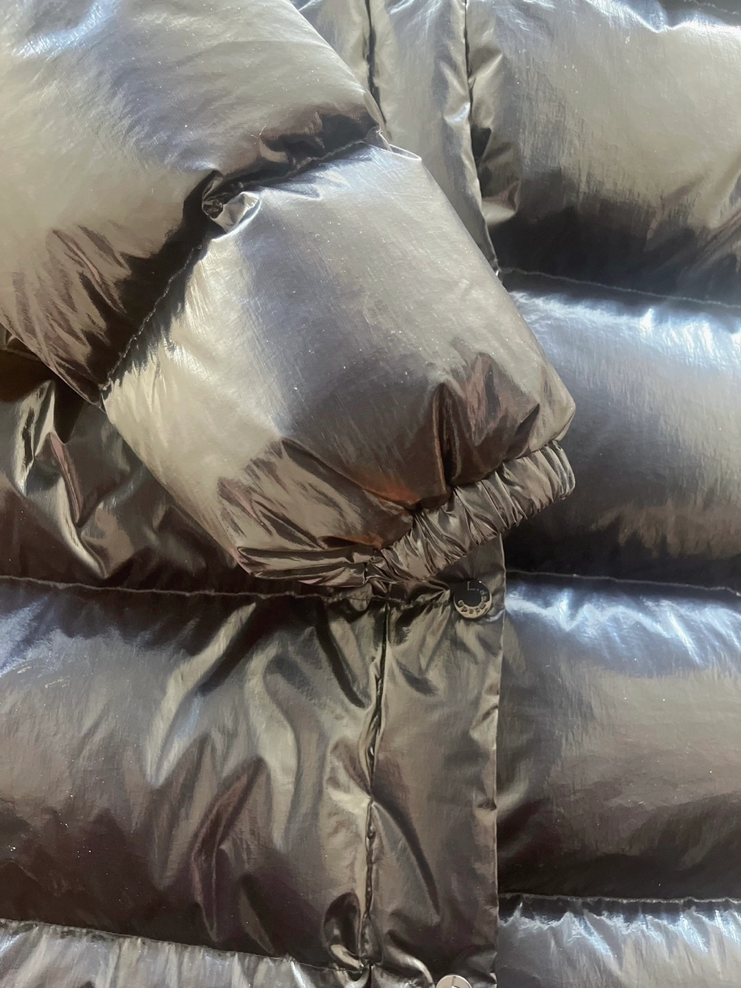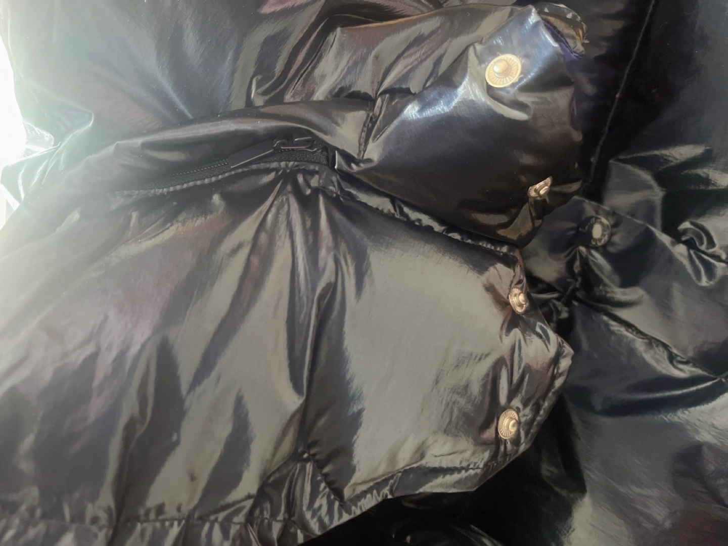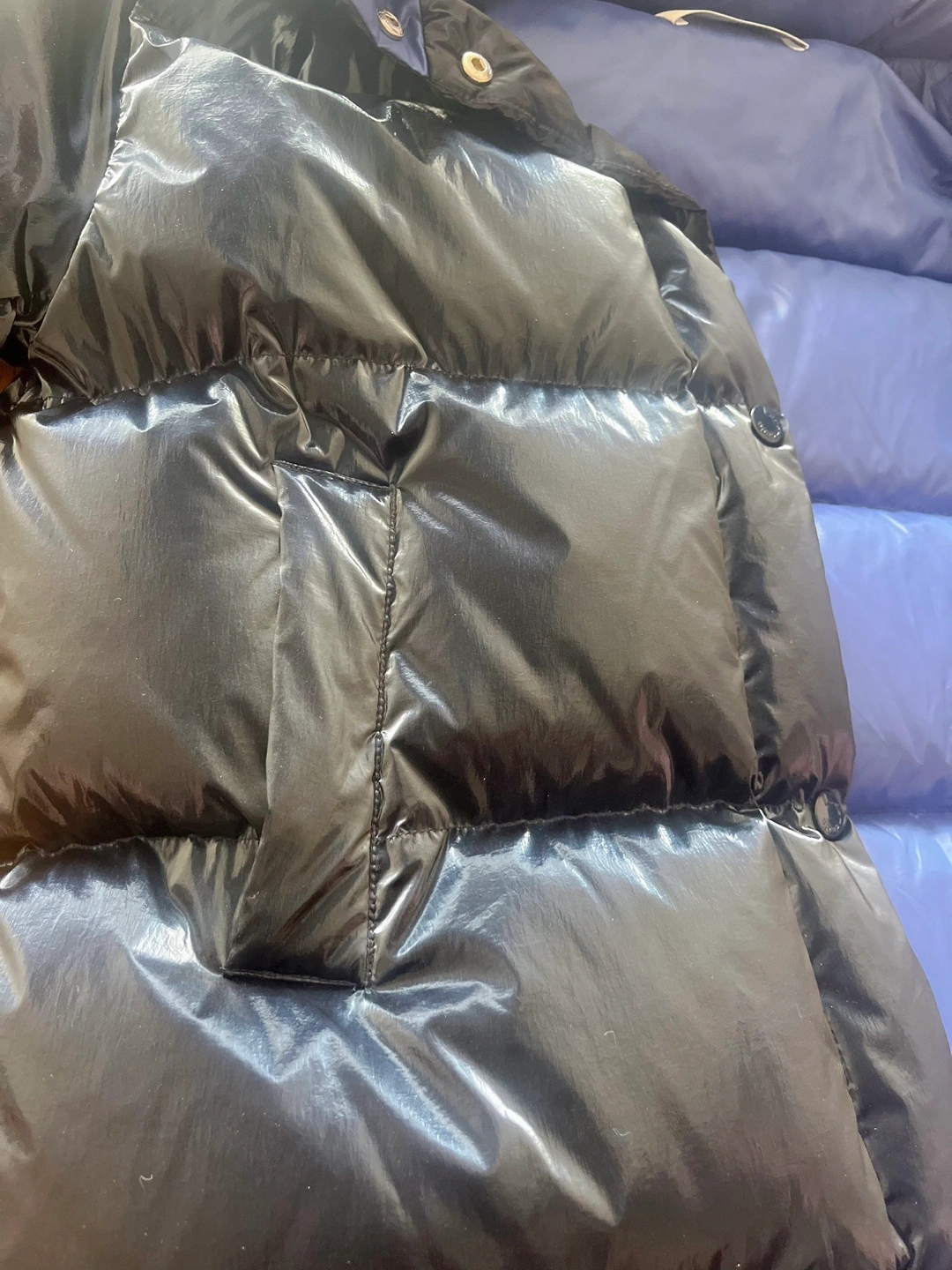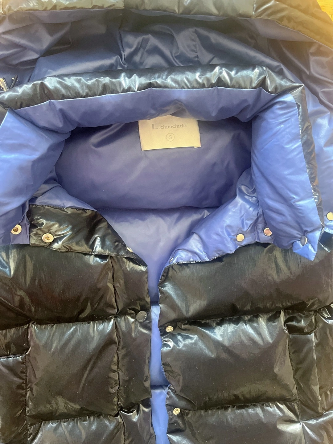 Medium to long goose down jacket. Shiny dark blue exterior. Blue interior. Snap closures. The hat of the down jacket can be removed. Chest circumference 116cm, clothing length 88.5cm.Only worn once.Excellent condition.Cash only.