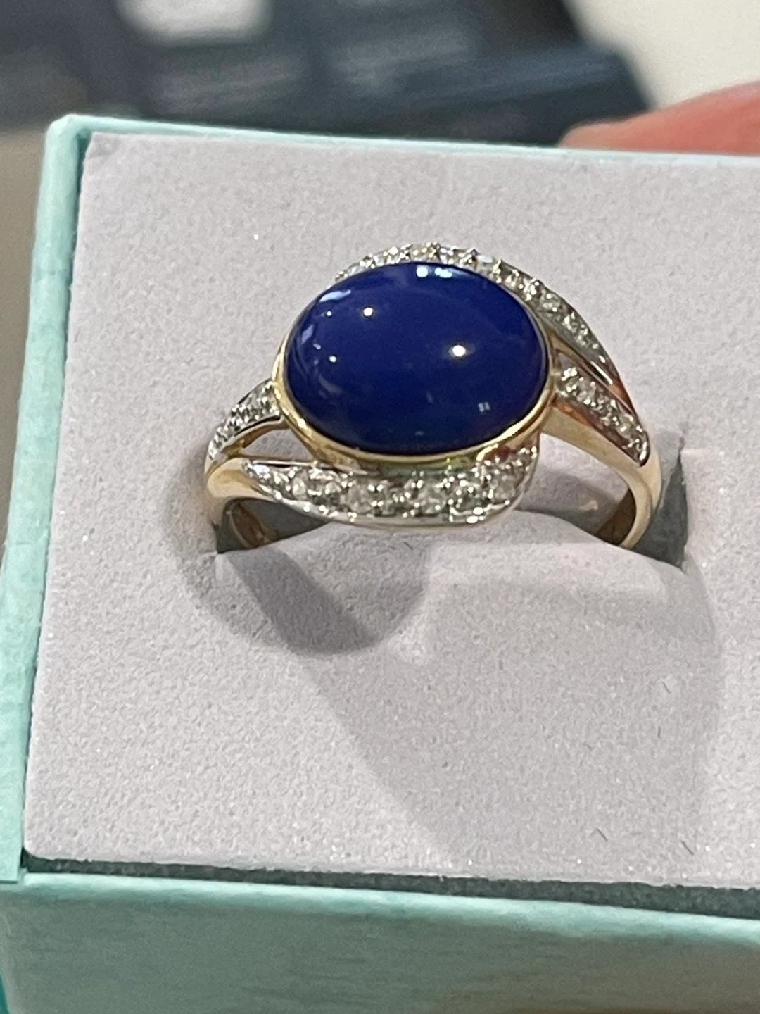 A beautiful 14k gold ring featuring a large, oval lapis lazuli stone surrounded by small diamonds. The band is crafted from gold. This ring would make a lovely statement piece.