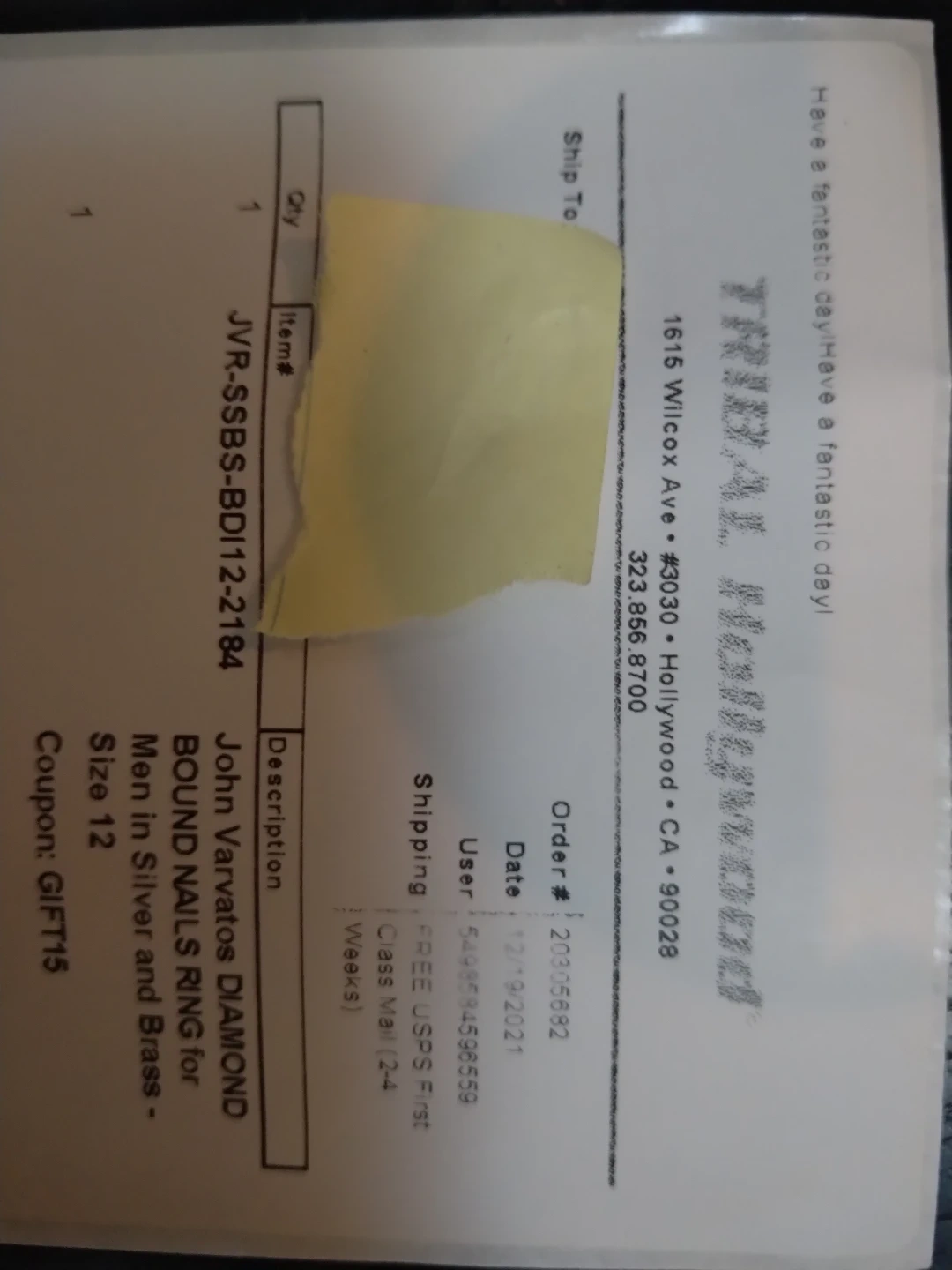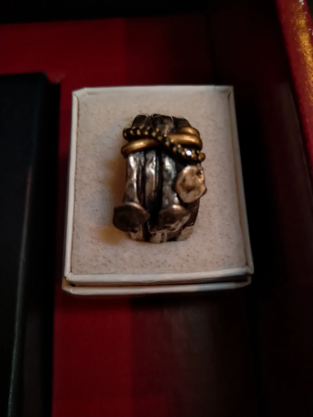 This is a Tribal Hollywood men's ring. It's a size 12, made from silver and brass. This ring is designed with a unique 'bound nails' style. The original box is included.