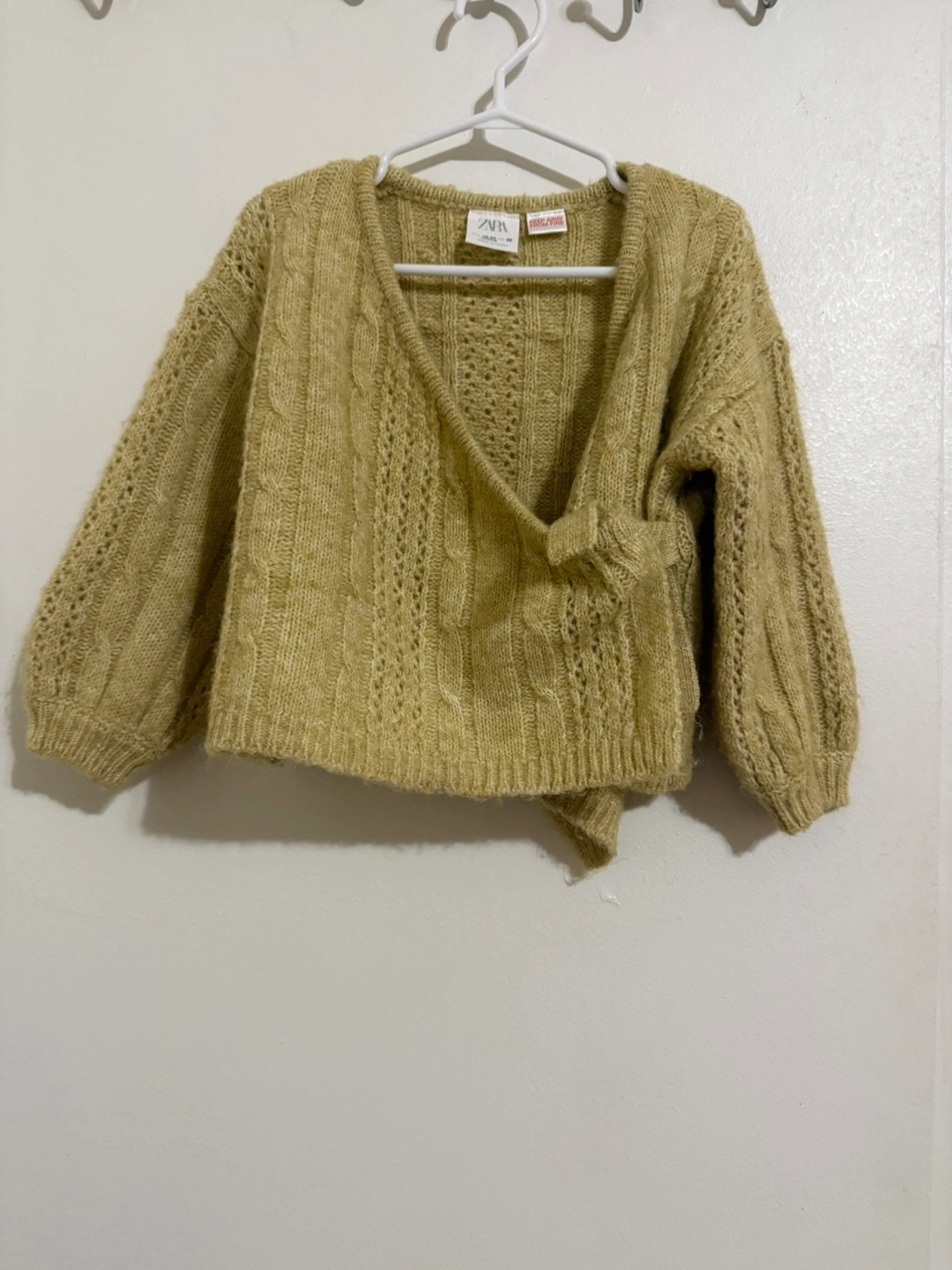 Selling a Zara knit wrap sweater.It's a lovely light yellow color and features a unique wrap design. Perfect for layering or wearing on its own!