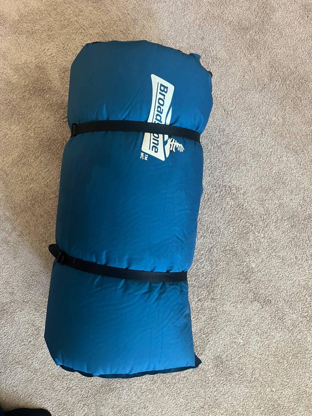 This is a Broadstone self-inflating sleeping pad. It's blue and rolls up compactly for travel. A handy camping essential!