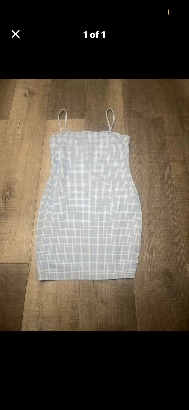 This is a cute light blue plaid mini dress with thin straps. It's a fitted style. Perfect for a casual day out or for layering!