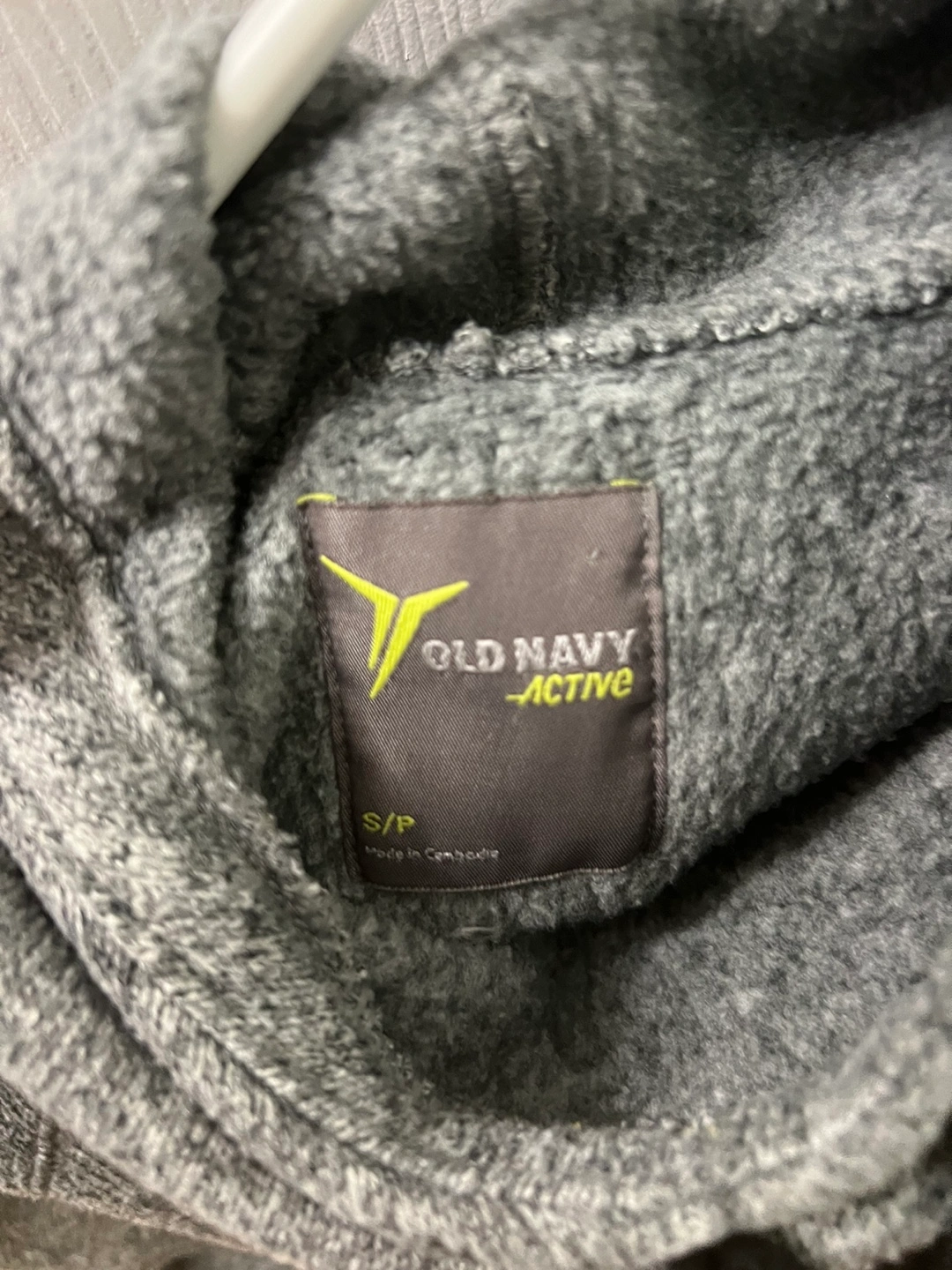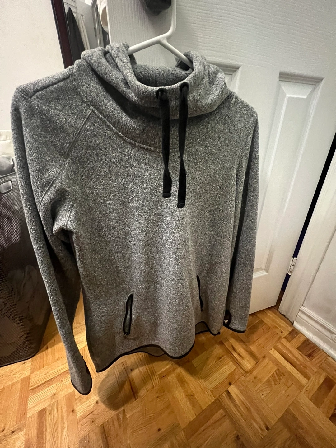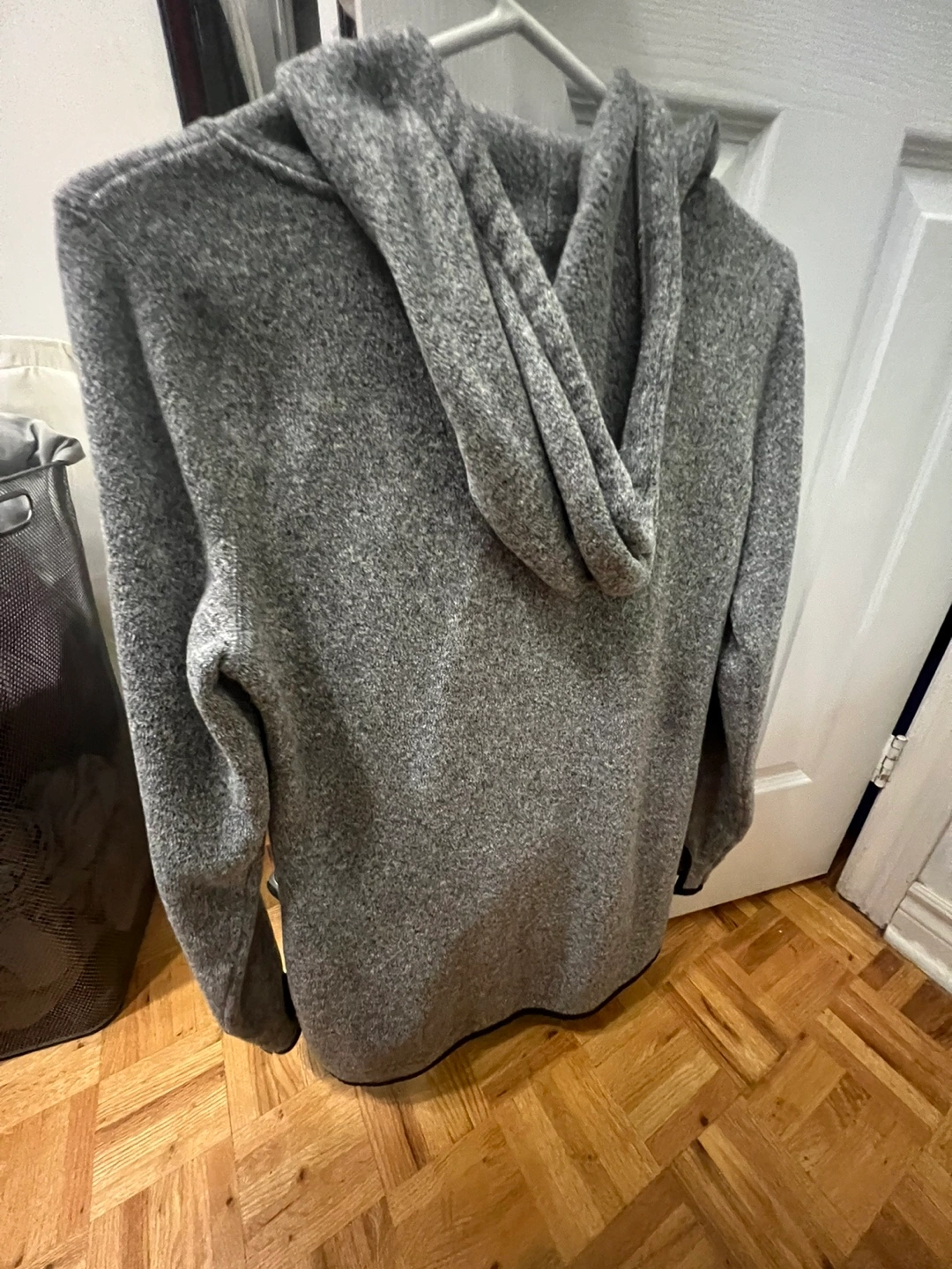 Grey fleece hoodie. Small size. Drawstring hood. Kangaroo pocket. Long sleeves.