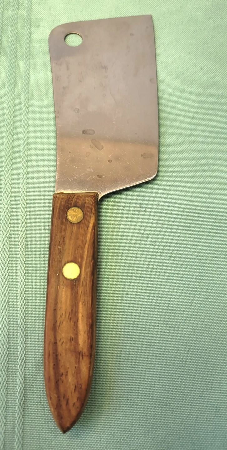 Condition: This cleaver is in vintage condition with regular wear. The blade shows light surface marks consistent with age, and the wood handle has a beautiful, aged finish. It remains structurally sound and ready for use or display.