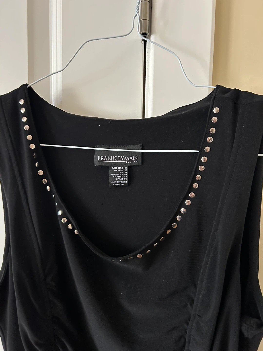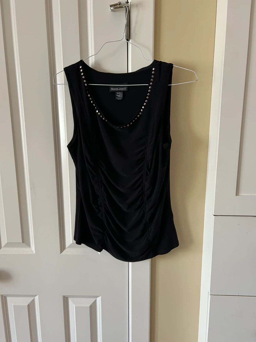 A sleeveless black tank top by Frank Lyman Design. It features a ruched front and decorative studs around the neckline. Made in Canada.