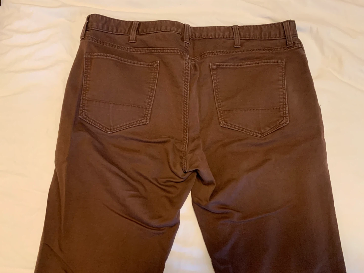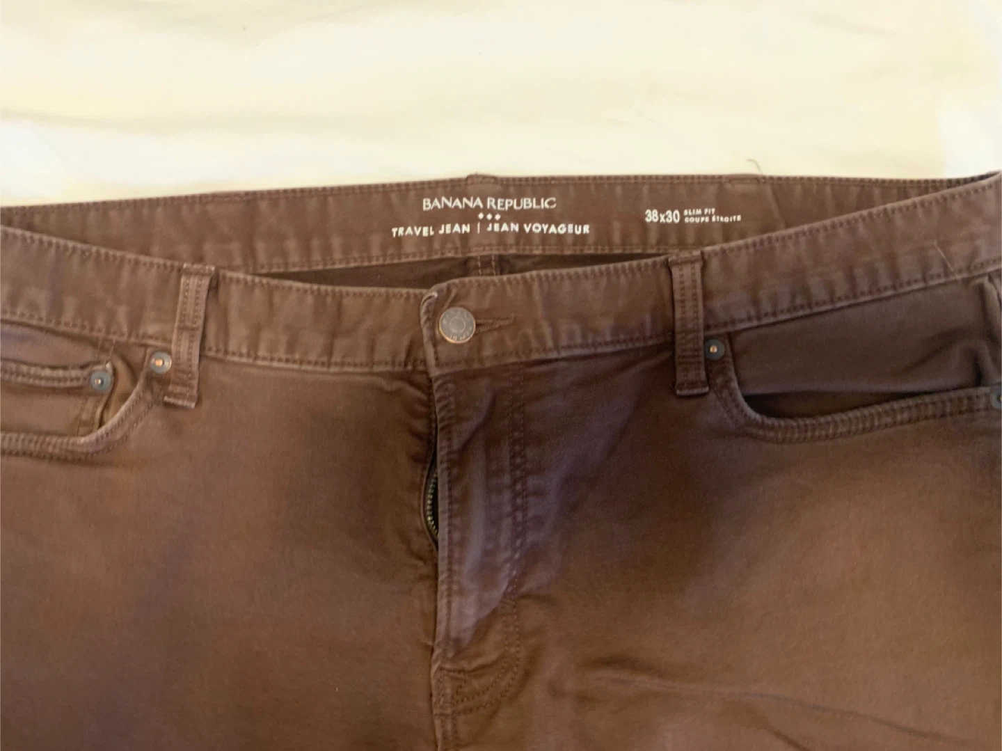 Selling a pair of Banana Republic Travel Jeans in size 36x30. The jeans are a nice brown colour and are in great shape. Perfect for travel or everyday wear!