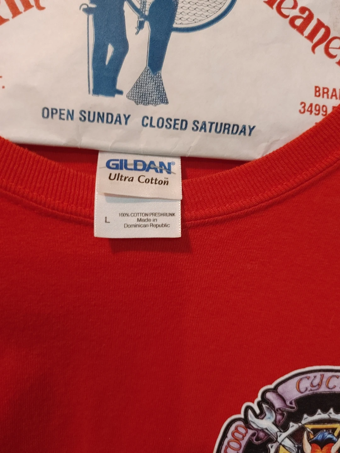 This is a red Gildan Ultra Cotton t-shirt in size large. It's made from 100% pre-shrunk cotton. The shirt features a graphic design with 'Ghost Souls Cycle Toronto B.C.' text.