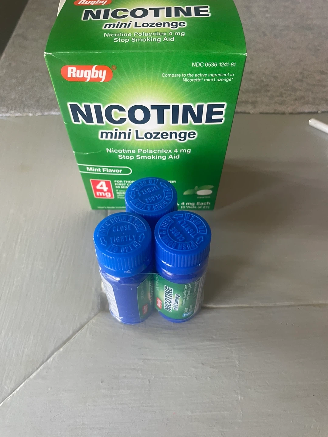 This is a box of Rugby Nicotine mini lozenges in mint flavor. Each lozenge contains 4 mg of Nicotine Polacrilex. It's a stop smoking aid. The box contains 81 lozenges, packaged in 3 vials of 27 lozenges each. One vial expires 2026/08 and another expires 2026/11.
