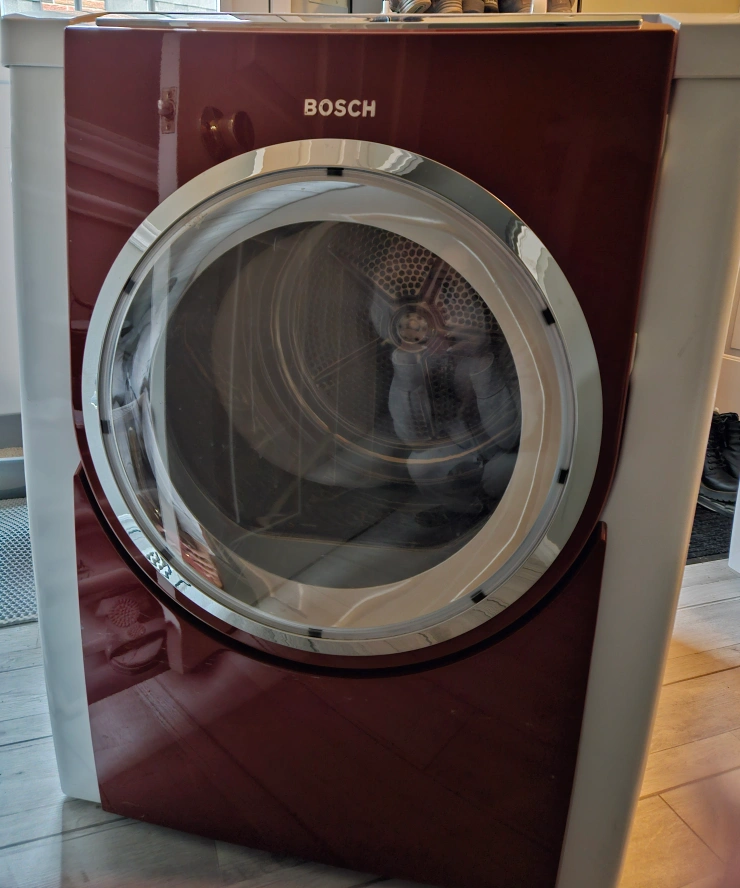 Bosch clothes dryer in a striking red and white colour scheme. It's a front-loading appliance with a large glass door. This dryer is designed for efficient laundry care. Washer broke, had to get a new set but the dryer is in good working condition. Dim: 27" W x 48" D with door open 90 legs x 37" H