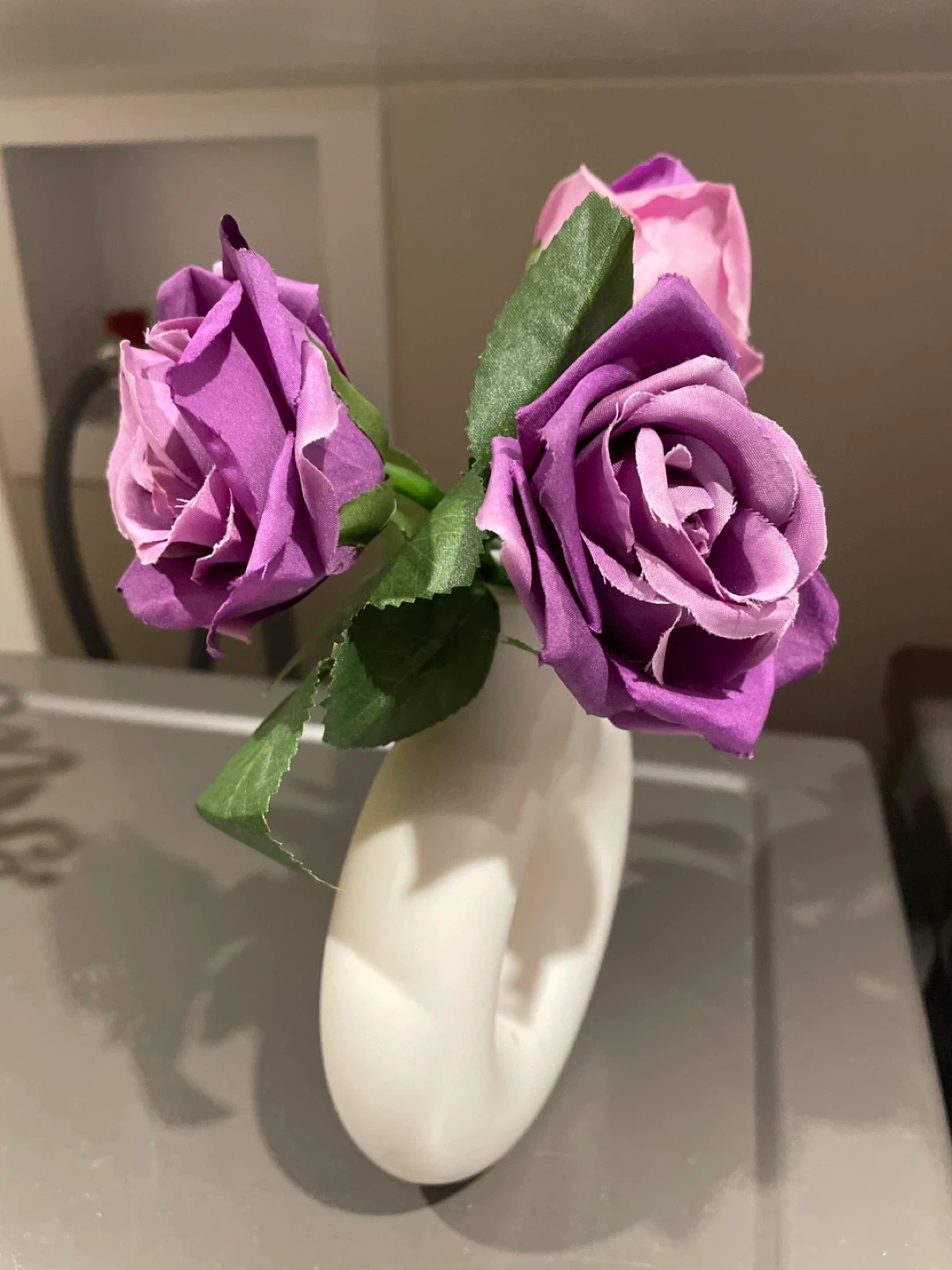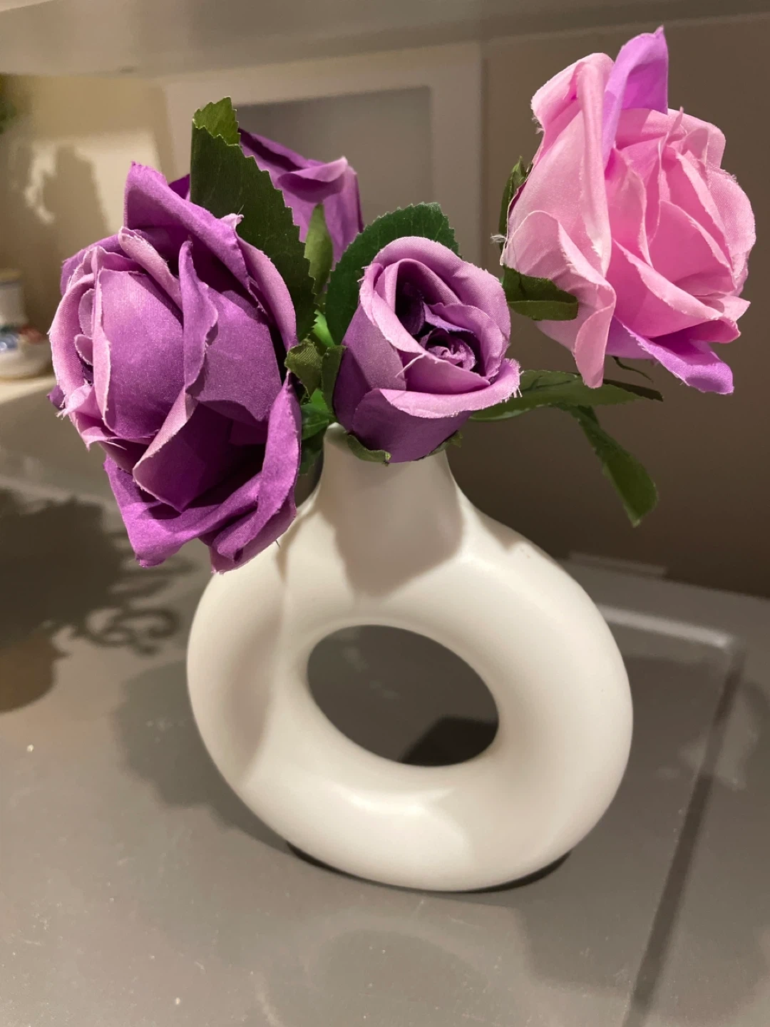 This set includes artificial roses in shades of pink and purple, presented in a modern white vase with a unique circular opening. It's a lovely decorative piece for any room. The vase is ceramic.