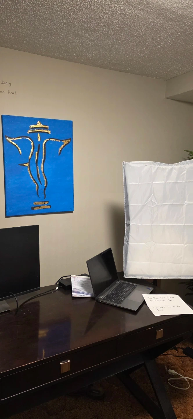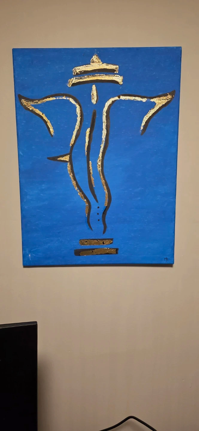 This is an abstract painting of Ganesha on a vibrant blue canvas. It features bold lines and metallic gold accents. The artwork is signed by the artist. It's a unique piece to add to your home decor!