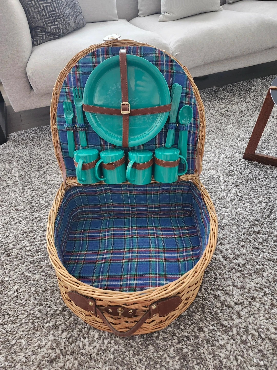 This sturdy D-shaped wicker basket features a beautiful blue tartan lining and a complete 4-person dining set in a vibrant teal finish. Perfect for park dates, beach trips, or backyard brunch.