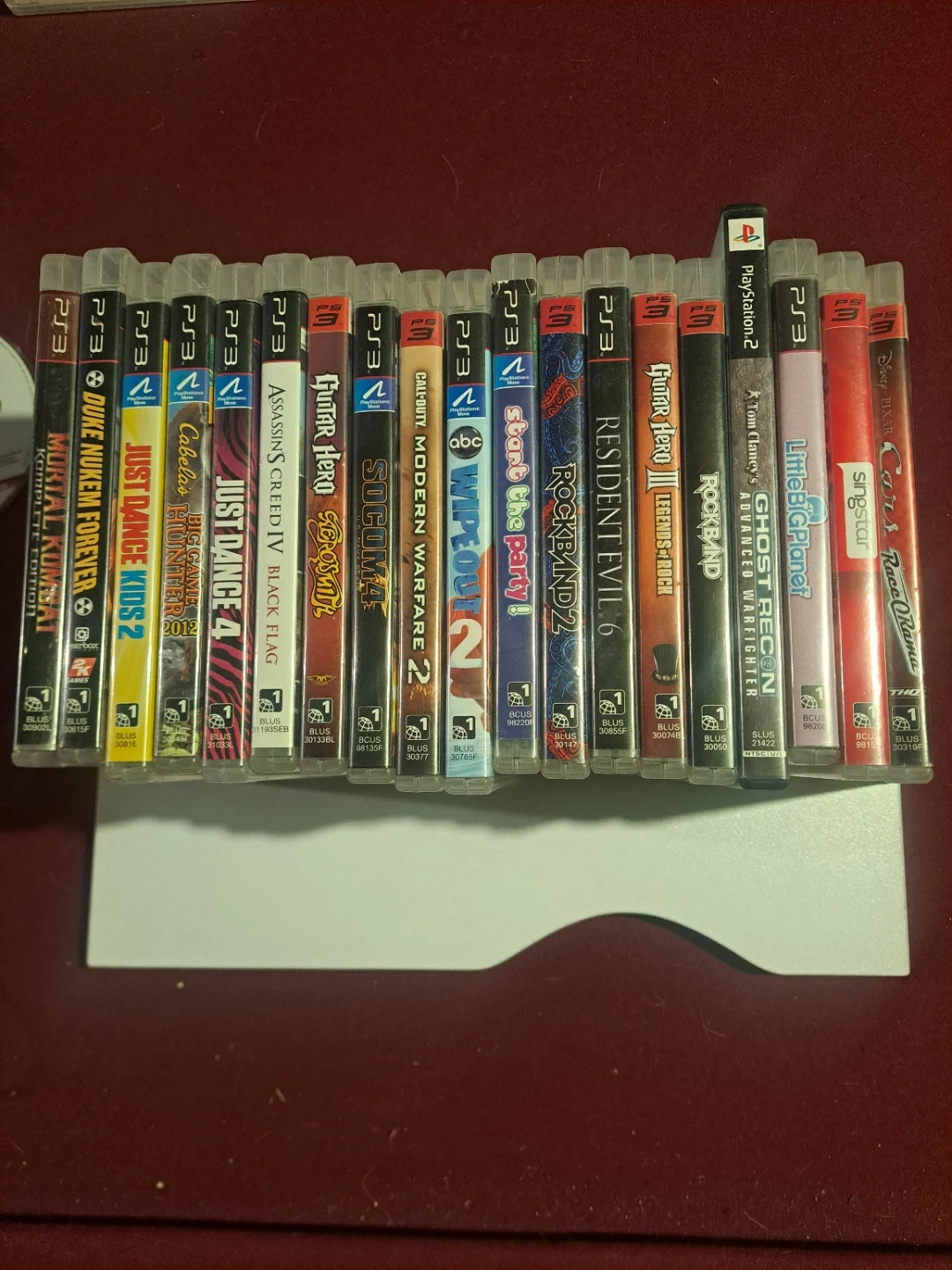 This is a collection of PlayStation 3 games. It includes titles like Mortal Kombat, Duke Nukem Forever, Just Dance, and Resident Evil. There's also a PlayStation 2 game, Tom Clancy's Ghost Recon.